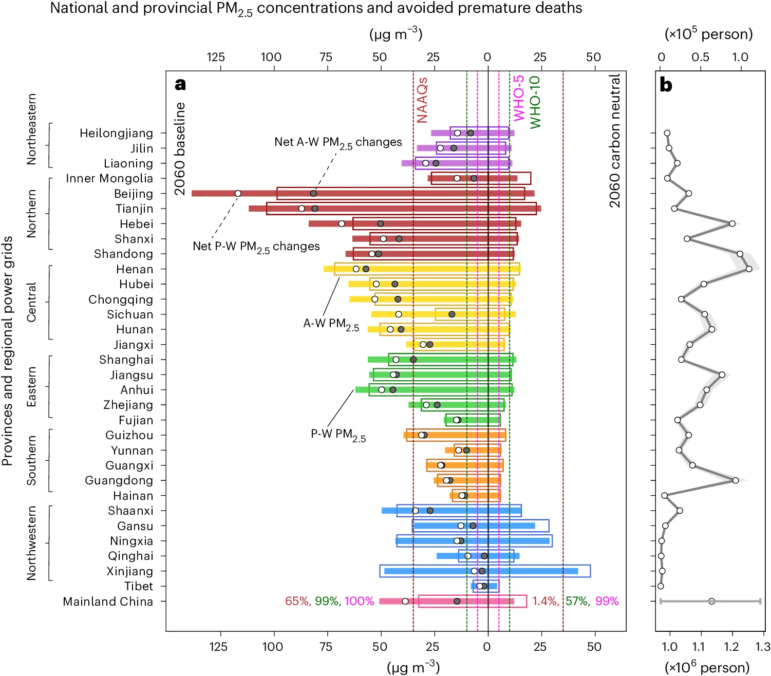 a、 在中国大陆2060年基线和2060年碳中和的情景下,省级P-W(彩色条)和a-W(实线)PM2.5表面浓度与国家(NAAQs,洋红色虚线)和世界卫生组织空气质量指南(WHO-10,绿色虚线;WHO-5,红色虚线)相比。填充点和开放点分别表示2060年碳中和的和2060年基线情景之间A-W和P-W PM2.5浓度的净变化。品红、绿色和红色数字分别代表全国超过NAAQs、WHO-10和WHO-5的人口比例。不同电网中的省份用不同的颜色表示。b、 省级避免了过早死亡,白点代表平均值,灰色阴影(误差带)和误差条代表第2.5和97.5百分位数(n=10000)。