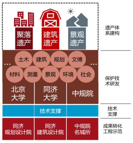 经自然资源部批准,由同济大学牵头,与中国城市规划设计研究院、北京大学共建“国土空间文化遗产保护与再生工程技术创新中心”。同济大学常青院士为创新中心主任,中国城市规划设计研究院团队负责人为鞠德东教高、北京大学团队负责人为汪芳教授。该中心以历史文化的空间载体-建成遗产(builtheritage)保护与再生, 作为广义国土空间资源保护的重要组成部分及核心历史使命;将不同归口、不同类别的遗产管控,纳入国土空间规划的“一张图”系统,也即将点状、线状和片状的建成遗产空间,整合到区域性的文化遗产空间体系之中。