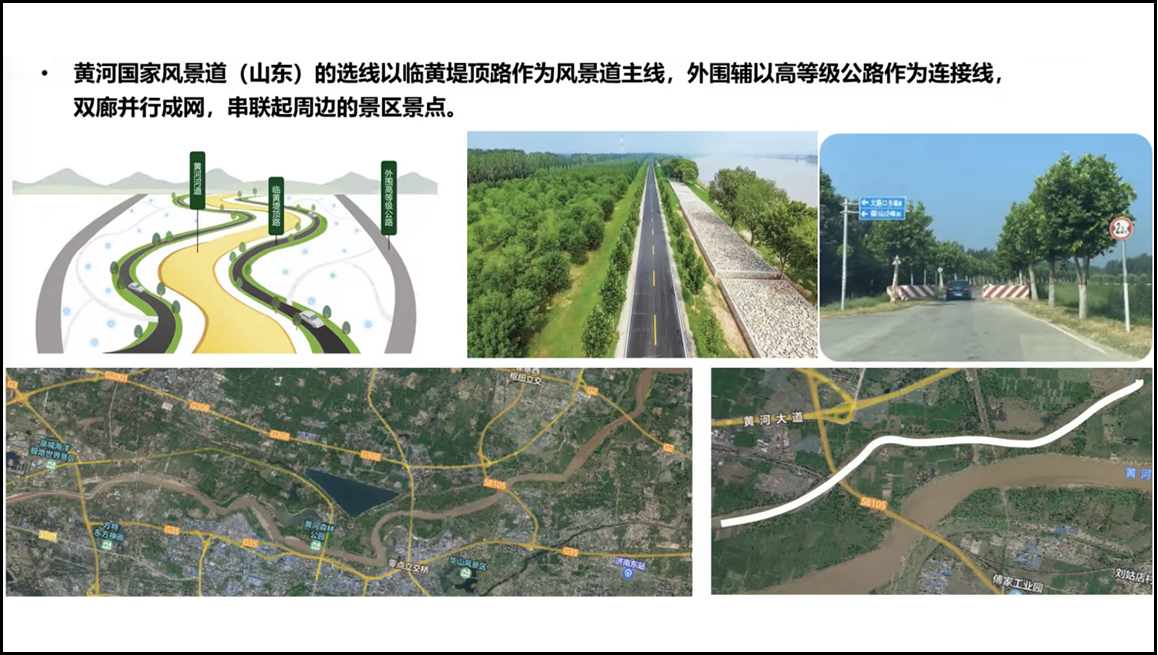从2022年6月28日开始,赵虎教授团队即开展工作座谈及外业调研,对沿黄9市25个县市展开了实地考察调研,同时开展问卷调查设计及填报工作,基于大量黄河山东段的一手资料,归纳总结其道路建设、景观绿化、配套设施等方面的基本情况。随后,报告分享了黄河风景道规划建设在选线、构成、分类三个关键问题上的策略。
