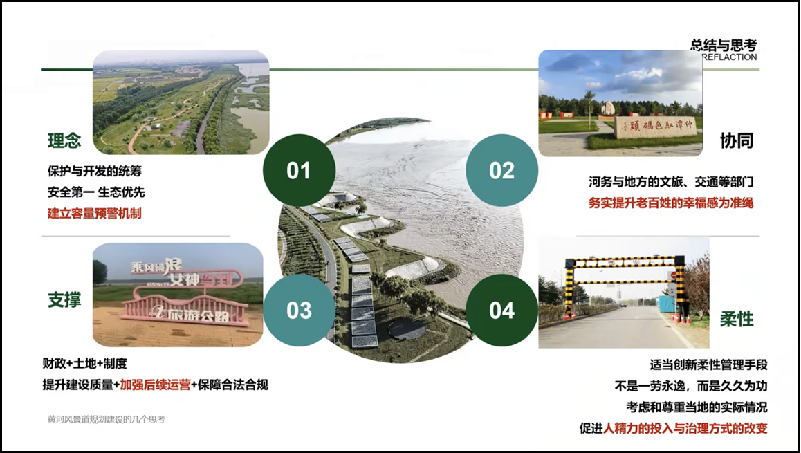 最后,赵虎教授用理念、协同、支撑、柔性四个关键词总结了山东黄河风景道规划建设方方面的思考。首先,理念需坚持保护与开发统筹、安全第一,生态优先,建立容量预警机制;其次,需以财政、土地等制度为支撑,保障合法合规地提升建设质量并加强后续运营;此外,要形成河务与地方文旅、交通等部门协同合作;最后则要尊重当地实际情况,适当创新治理方式,促进风景道的长期完善。