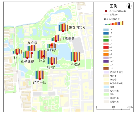 燕园样本区域历史建筑与场地生态环境耦合协调度月度分布差异