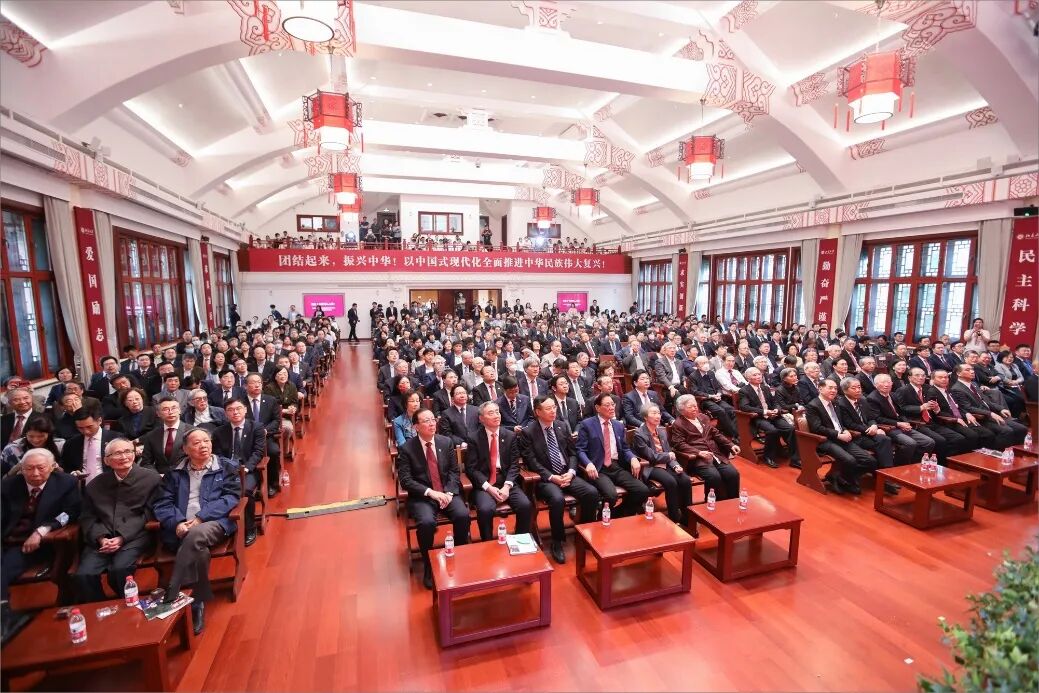 会场悬挂着“团结起来,振兴中华,以中国式现代化全面推进中华民族伟大复兴”的横幅,振奋人心。