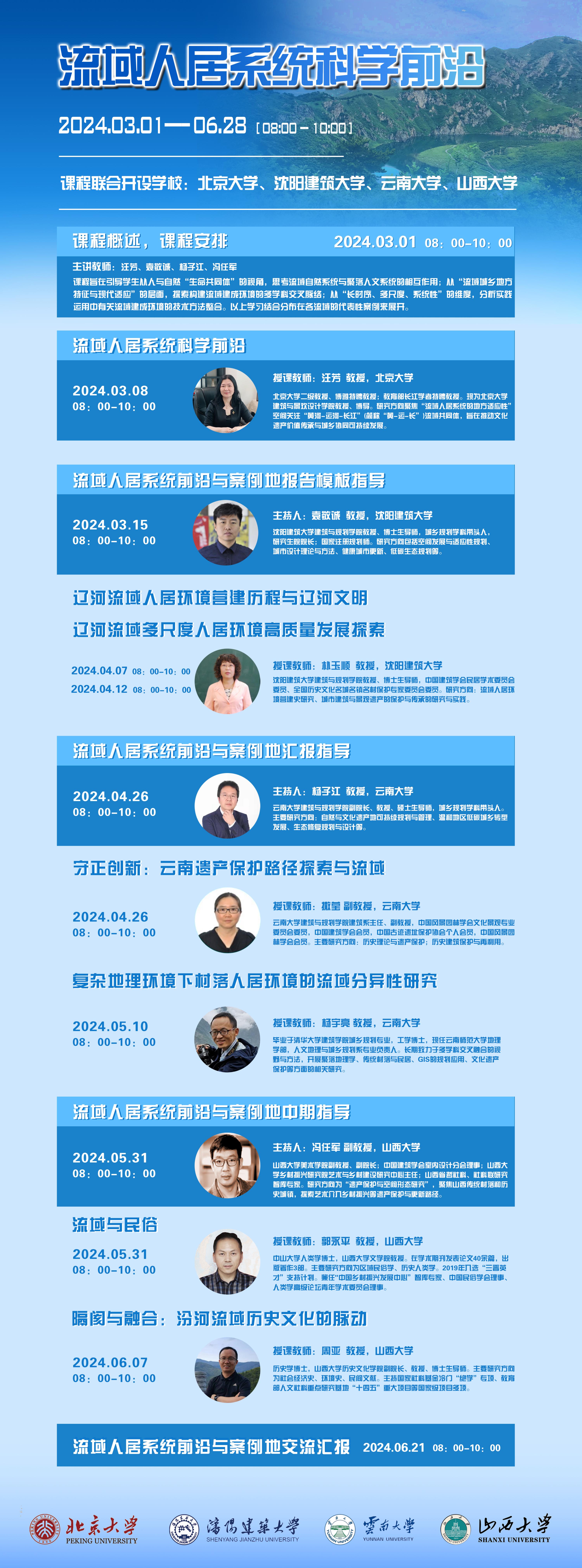 基于以上背景和共识,2024年春季“流域人居系统科学前沿”课程由北京大学、沈阳建筑大学、云南大学、山西大学四校联合开设,汪芳教授组织召集,袁敬诚教授、杨子江教授、冯任军副教授共同负责。四所高校分别位于海河流域、辽河流域、长江流域、黄河流域,这为教学内容的多样性、丰富性提供了很好的支撑。