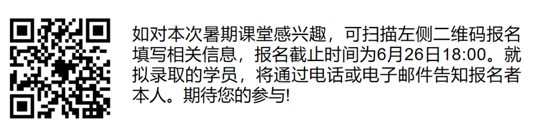 2)报名方式:报名方式(以下两步均需完成):扫描问卷二维码填写报名信息;并点击文末“阅读原文”下载学员申请表,填写完整后发送至邮箱ual_sq2024@163.com,邮件主题请按照“姓名-单位-暑期学校申请”的格式填写;