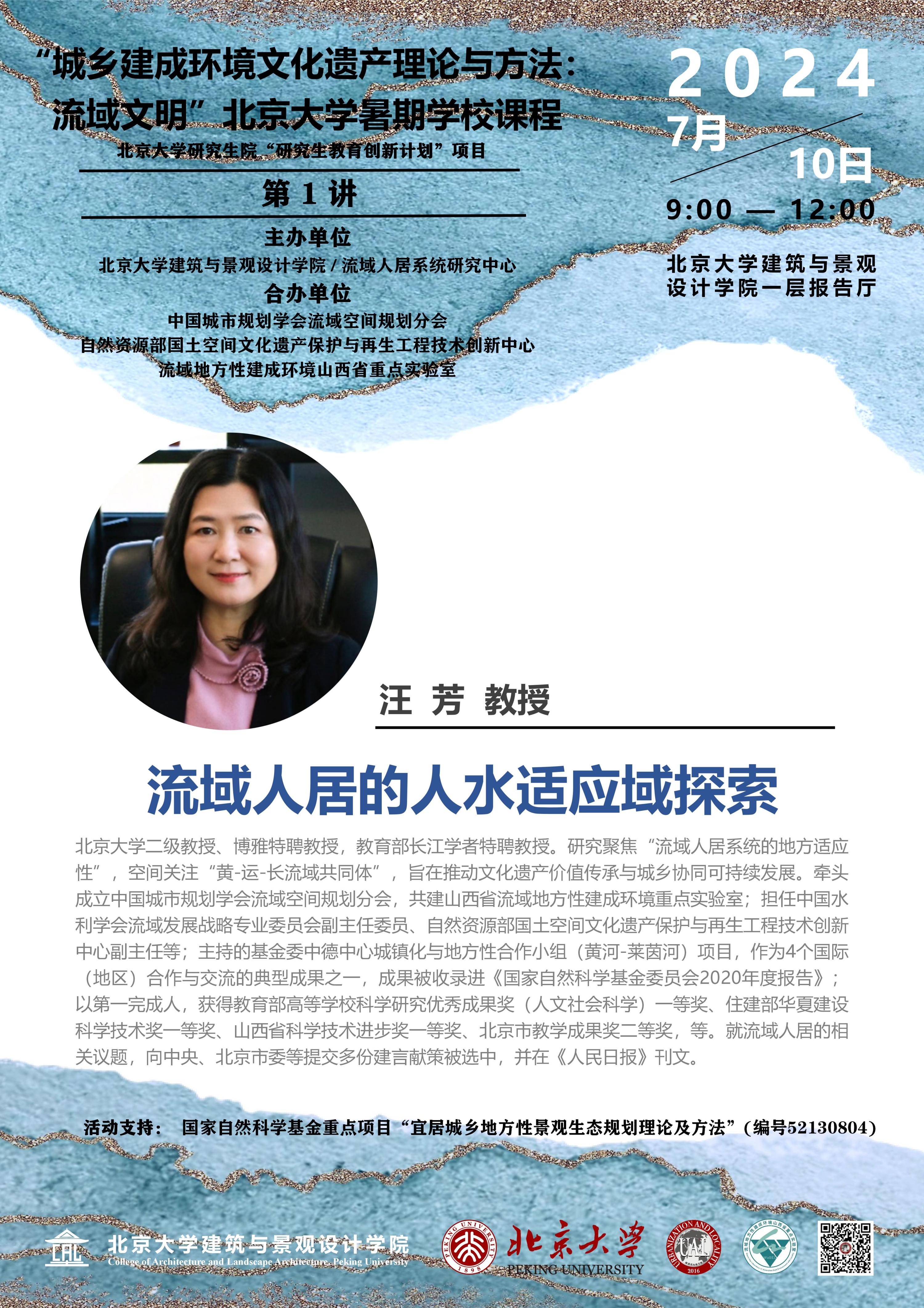 为了促进全国高校之间优秀研究生、青年教师的互动与交流,在2024年7月10日-7月19日举办“城乡建成环境文化遗产理论与方法:流域文明”北京大学暑期学校课程。课程为北京大学研究生院的“研究生教育创新计划”项目,主办单位为北京大学建筑与景观设计学院/流域人居系统研究中心,合办单位为中国城市规划学会流域空间规划分会、自然资源部国土空间文化遗产保护与再生工程技术创新中心、流域地方性建成环境山西省重点实验室。课程负责人为汪芳教授。