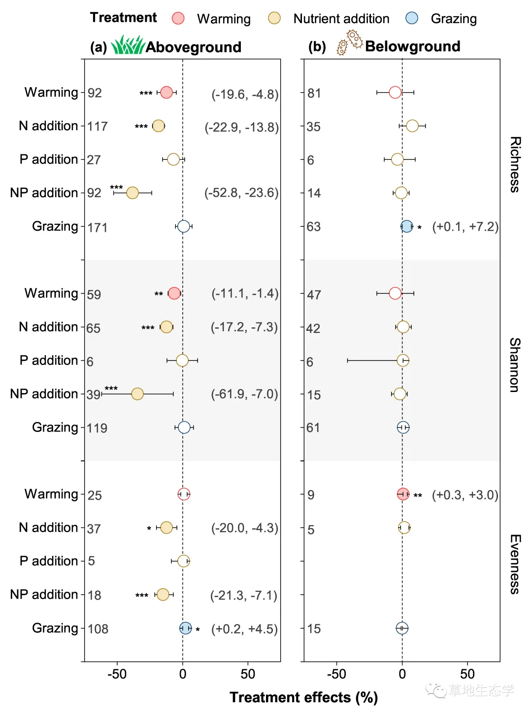 图 地上和地下生物多样性对增温、养分添加和放牧的响应