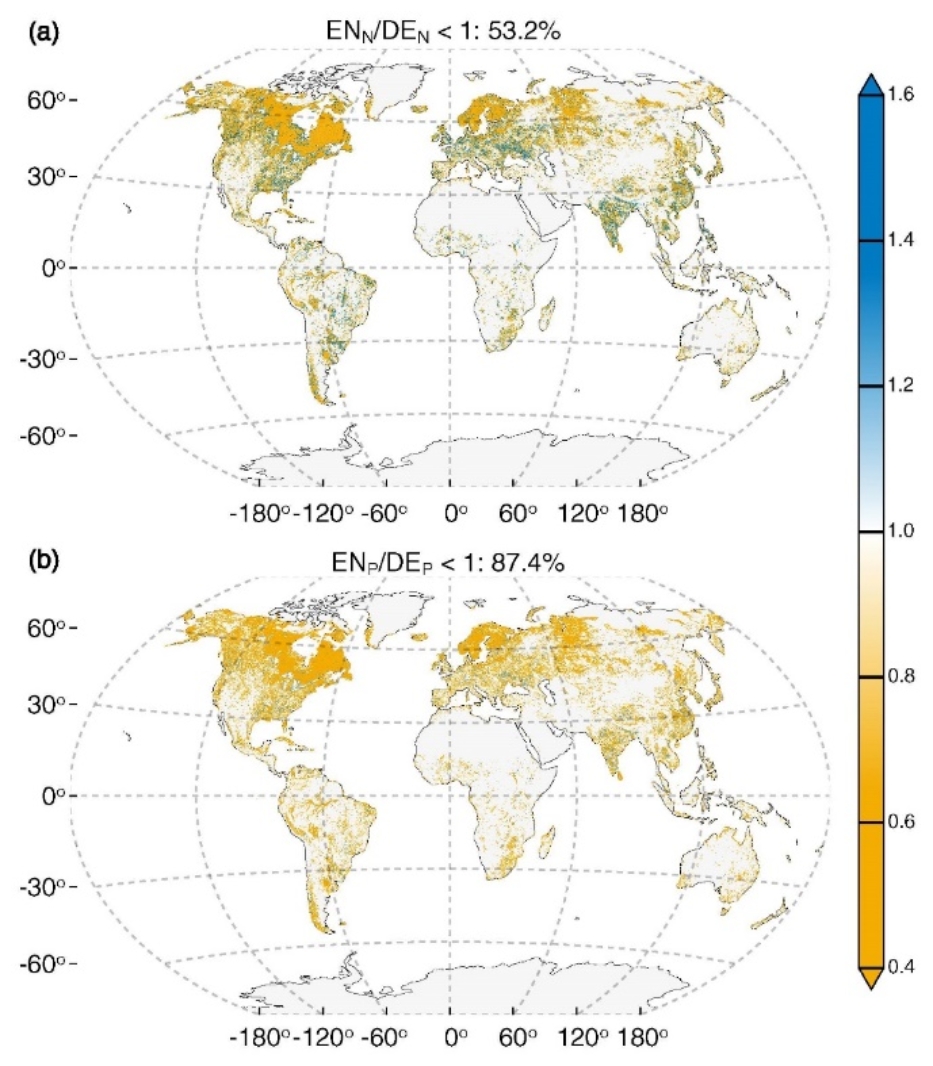 图全球湖泊的氮磷截留结果分布,其中(a) 和(b)分别代表氮和磷的湖内EN/DE比值(enrichment/depletion)。