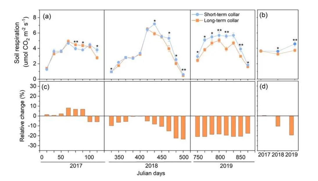 目前,研究成果以“Long-term collar deployment leads to bias in soil respiration measurements”为题正式在线发表于国际重要生态学期刊《生态学与进化研究方法》(Methods in Ecology and Evolution)上。兰州大学草地农业科技学院2019级博士生马小亮为论文第一作者、贺金生教授为论文通讯作者、蒋胜竞青年研究员、北京大学博士生张智起、生态学院宋超教授和汪浩青年研究员为论文共同作者。该研究得到了国家自然科学基金项目(32130065和32192461)的资助。