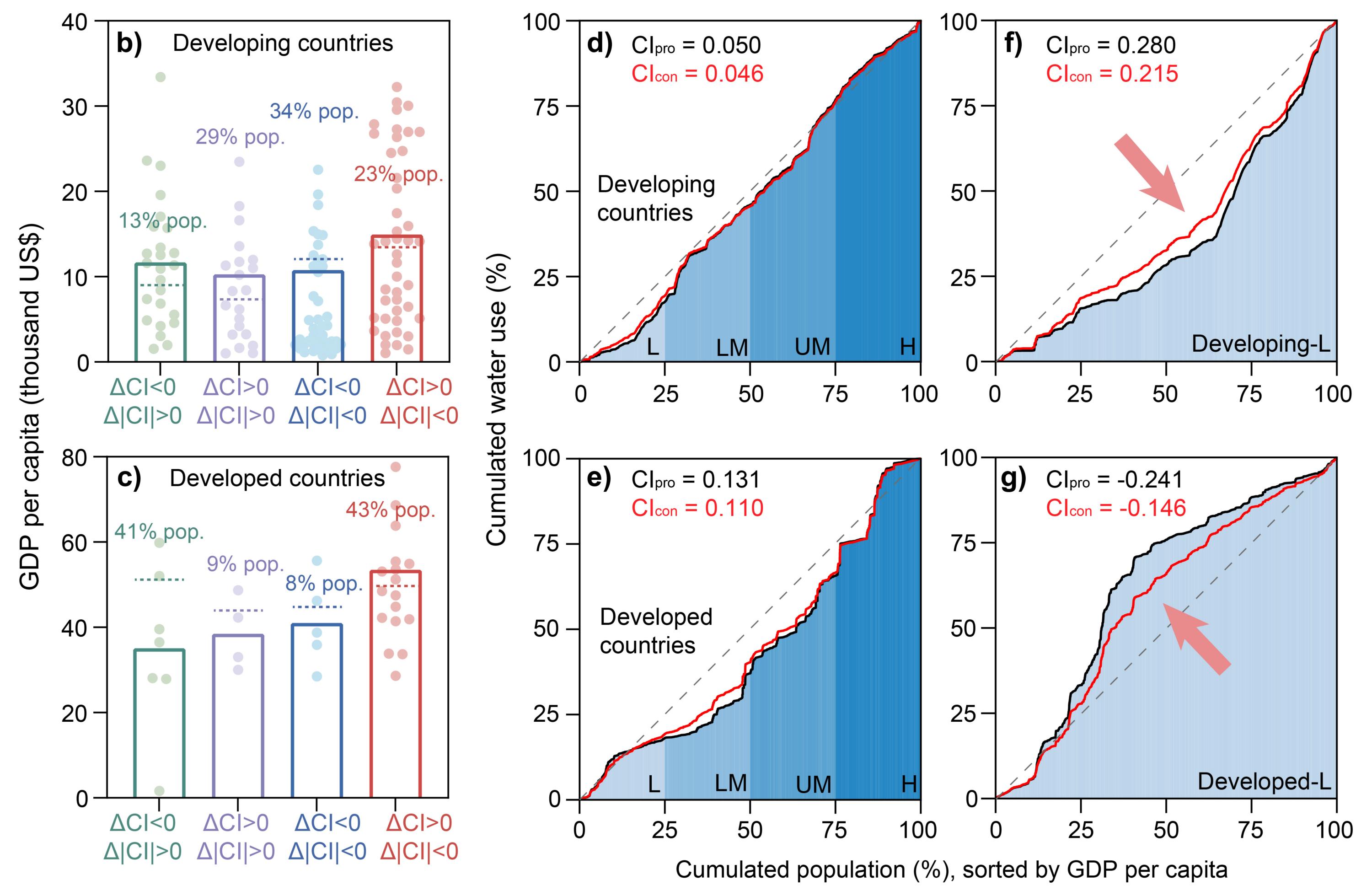 图 全球农业贸易导致的发达国家和发展中国家中不同收入人群的用水平等性及公平性变化