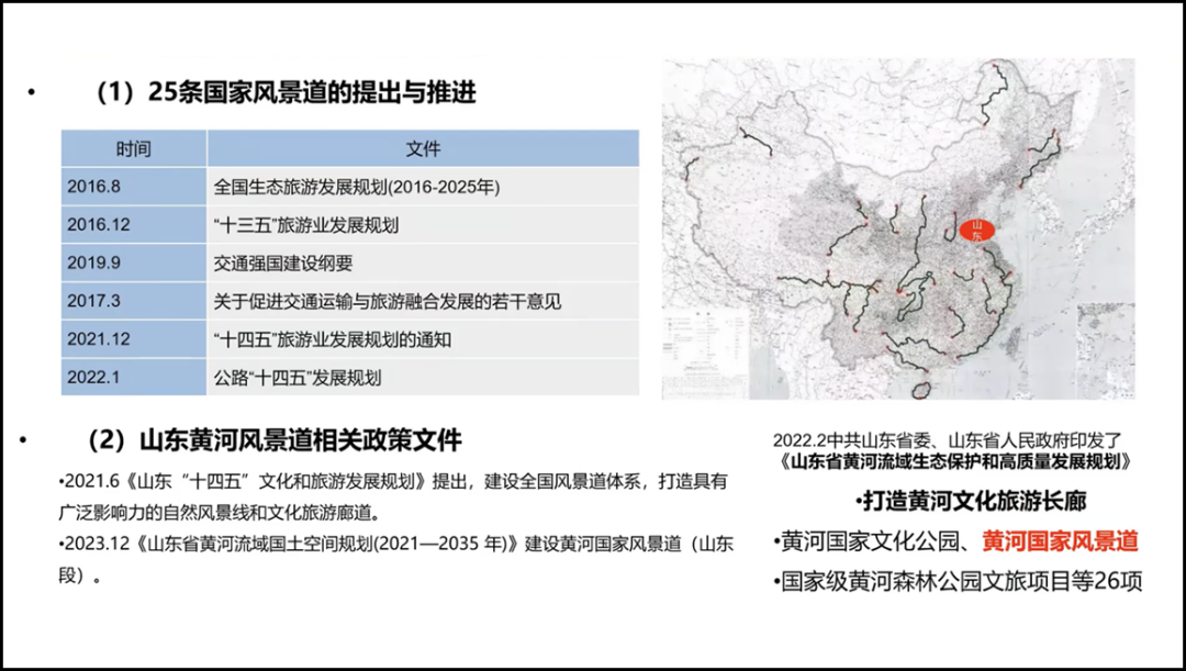 赵虎教授首先结合国家发展需求及相关政策文件讲述了山东黄河风景道规划建设的背景。早在2016年,全国生态旅游发展规划就提出要建设25条国家级风景道,随后文旅部、交通部等相关部委也在专项规划中提出国家风景道建设工作。在落实黄河流域生态保护和高质量发展战略的背景下,中共山东省委、山东省人民政府于2022年印发了《山东省黄河流域生态保护和高质量发展规划》,在此背景下,《黄河国家风景道(山东)建设指南》开始考察、编制到评审等工作,于2022年12月正式印发。