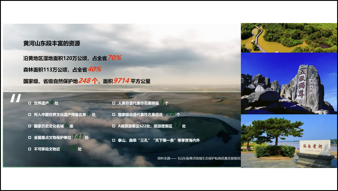 黄河山东段长628公里,占黄河总长度的11.5%,沿黄地区具有丰富的自然、文化、旅游资源。不仅有占全省70%的湿地面积,还有4处世界遗产、6座国家历史文化名城、141处全国重点文物保护单位、超过600处A级景区和13处旅游度假区。