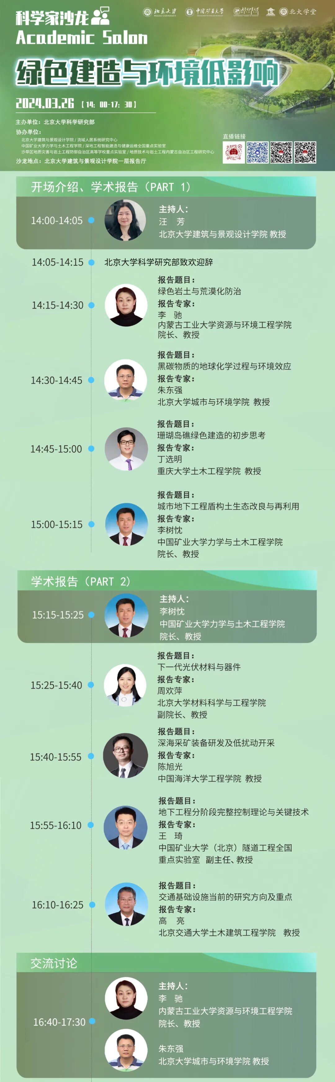 2024年3月26日,“绿色建造与环境低影响”科学家沙龙活动将由北京大学科学研究部主办,北京大学建筑与景观设计学院 / 流域人居系统研究中心、中国矿业大学力学与土木工程学院 / 深地工程智能建造与健康运维全国重点实验室、沙旱区地质灾害与岩土工程防御自治区高等学校重点实验室 / 地质技术与岩土工程内蒙古自治区工程研究中心、北大学堂协办。共邀请到李驰教授、朱东强教授、丁选明教授、李树忱教授、高亮教授、周欢萍教授、陈旭光教授、王琦教授等8位报告专家。汪芳教授、李驰教授、李树忱教授为召集人。