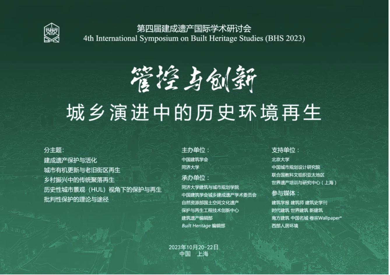 10月21-22日,以“管控与创新——城乡演进中的历史环境再生”为主题的第四届建成遗产国际学术研讨会在同济大学成功举办。本次研讨会由中国建筑学会与同济大学共同主办,同济大学建筑与城市规划学院、中国建筑学会城乡建成遗产学术委员会、自然资源部国土空间文化遗产保护与再生工程技术创新中心和《建筑遗产》、《Built Heritage》两刊编辑部联合承办。
