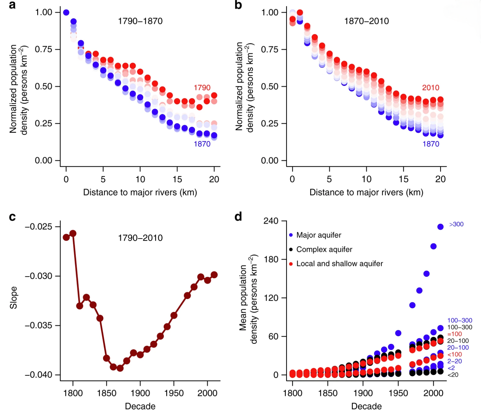 1790年a至1870年b和1870年至2010年,美国毗邻地区的归一化人口密度(NPD)与主要河流距离(DMR)之间的关系。c居住在主要河流附近的愿望不断变化,反映在NPD与DMR的斜率上。d 1790年至2010年各含水层类型上覆的平均人口密度。充值率(毫米/年)显示为抵消。我们使用红色到蓝色的梯度来指示a中截至1870年的几十年的趋势,以及b中自1870年起从蓝色到红色的几十年趋势。a、b的数据点基于DMR类别,而c和d的数据点则基于人口普查年份。