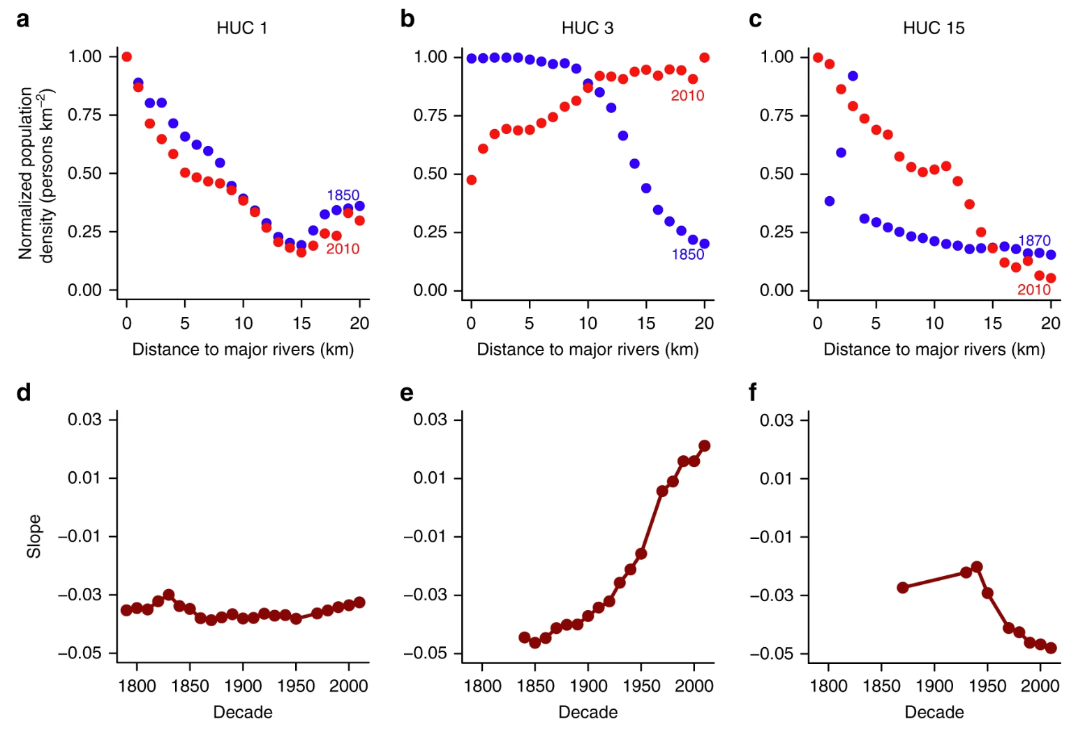 a HUC 1 1850–2010,b HUC 3 1850–2010和c HUC 15 1870–2010。d–f HUC 1、3和151790-2010的归一化人口密度(NPD)斜率与主要河流距离(DMR)的动态。仅具有p的坡度 < 0.05。a–c的数据点基于DMR类别,而d–f的数据点则基于人口普查年份。