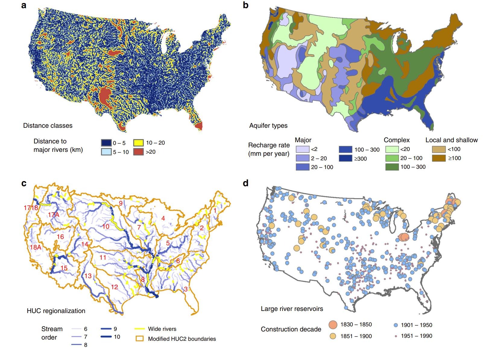 考虑到河流宽度,每个像素(1 km×1 km)与主要河流的计算距离(流序≥4)。b基于地质结构和地下水补给率的含水层类型。c选定的主要河流(流序≥6)和水文单位区域的修改边界。根据GWRL数据库,黄色表示河流宽度超过1公里。d随着时间的推移,大型河流水库的建设。