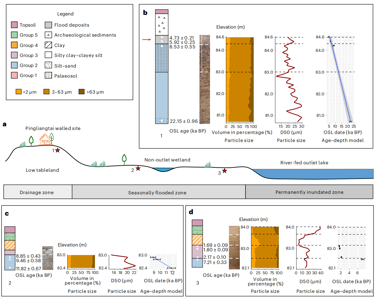 a、 城墙遗址周围重建的新石器时代晚期景观和环境示意图。平粮台遗址所在的低台地区属于排水带,台周围低洼地区为季节性淹没区。该湖被定义为永久淹没区。b、 位于平粮台内部的1号剖面岩石地层学,以及粒度分布和OSL测年结果。OSL年龄以平均值表示 ± 平均值的标准误差。至少使用九到十份等分试样来计算OSL年龄。D50为中值粒径,下同。120至520检查断面的沉积物 cm通常是细尺寸的,中等尺寸的范围从下到上逐渐减小。年龄-深度模型显示沉积速率通常很快,尤其是在地层的下半部分。c、 平凉台外剖面2的岩石地层学、粒度分布和OSL测年结果。不同尺寸颗粒的组成与剖面1中的那些相当。请注意,陡峭的年龄-深度曲线表明,与剖面1相比,全新世早期的沉积速率更快。d、 平凉台外剖面3的岩石地层学、粒度分布和OSL测年结果。注意OSL日期序列所显示的有趣的沉积间隙。在这一历史时期,粗颗粒的贡献也达到了峰值,这表明发生了高能沉积事件。除了沉积间断之外,还要注意历史时期沉积速率的大幅增加。粒度分析和OSL测年的详细描述和结果可在补充信息中找到。