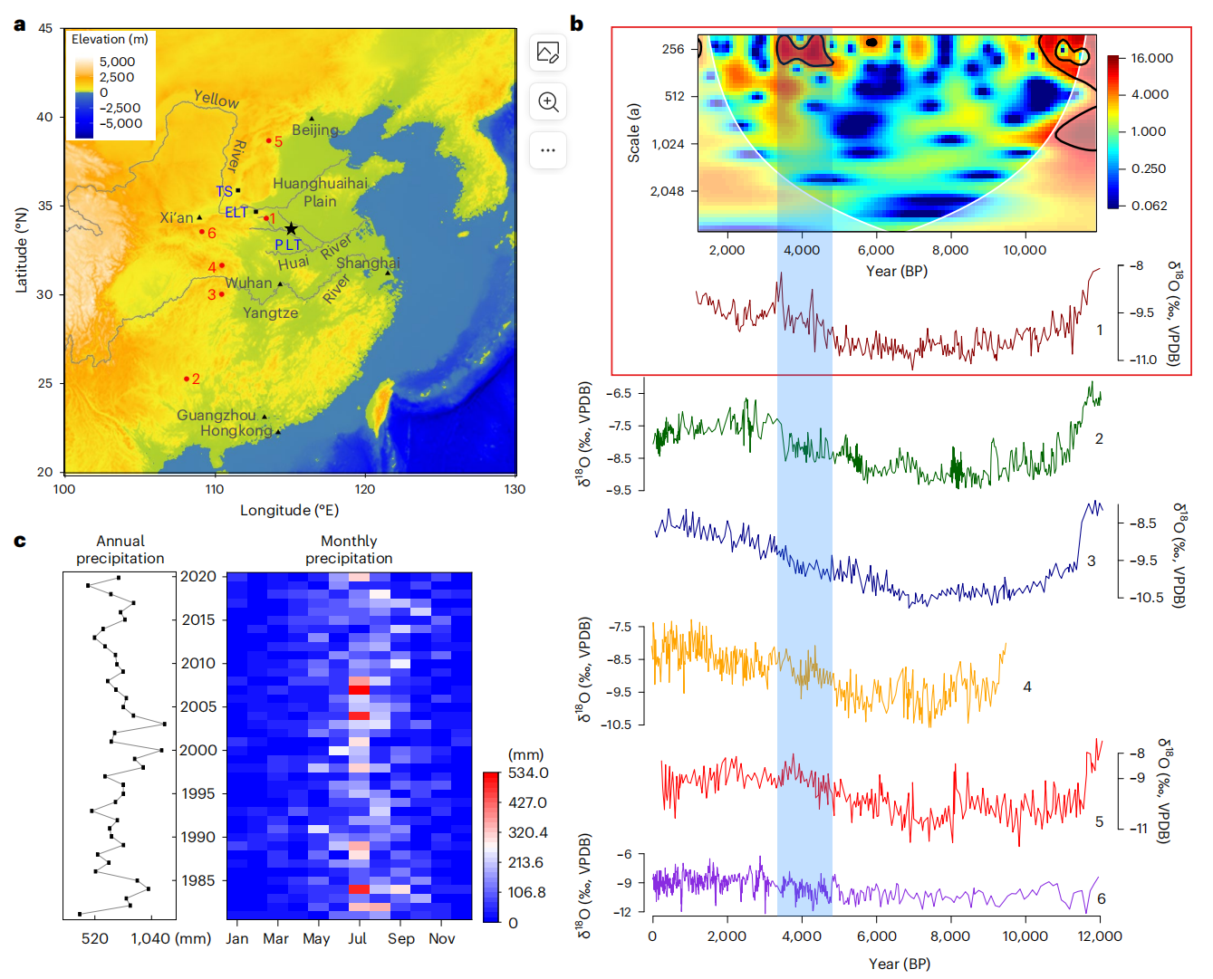 a、 平粮台(PLT)、二里头(ELT)和陶寺(TS)的位置,以及文中使用的洞穴主题。b、 (1)马沟洞62,63,(2)东阁洞64,65,(3)三宝洞66–68,(4)河上洞69,(5)莲花洞70和(6)酒仙洞71的δ18O记录(相对于维也纳Pee Dee Belemnite(VPDB)表示)和马沟洞δ18O数据的连续变换小波谱(尺度,年)。δ18O记录表明长期气候干旱趋势明显。在不同程度上,这些曲线,特别是曲线4、5和6,也表明短期降雨量波动增加。c、1981~2020年周口的月降水量和年降水量。请注意,在一些夏季月份,月降水量可能超过500 毫米(用红柱标记),而年降水量的波动也可能很大,一些干旱年份只有大约260毫米 毫米年降雨量和年降雨量超过1200的潮湿年份 毫米。
