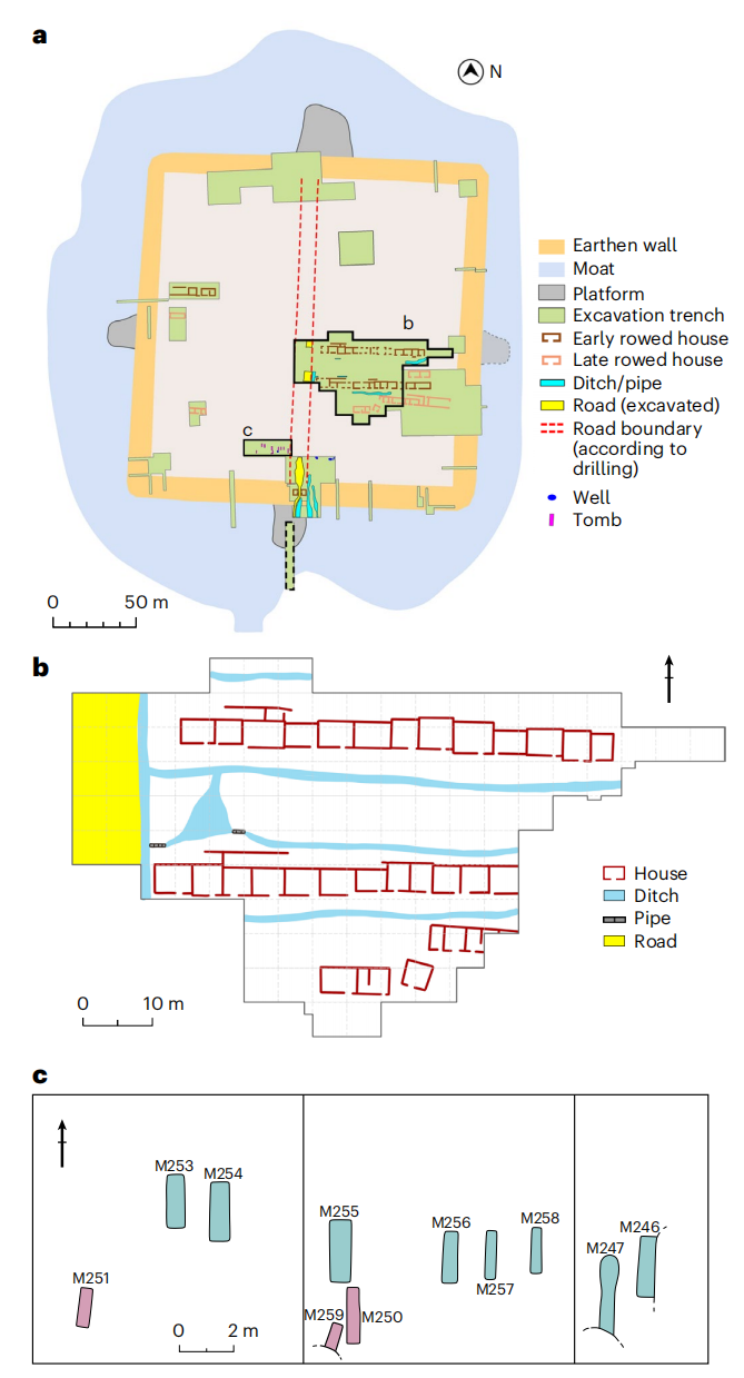 平凉台围墙遗址平面图。有关围墙场地的大小和结构的简要描述,以及场地不同功能部分的图例,请参阅文本。b、2016年和2019年开挖区改建房屋、道路和排水系统示意图。具体方案见图8。c、 公共墓地平面图。