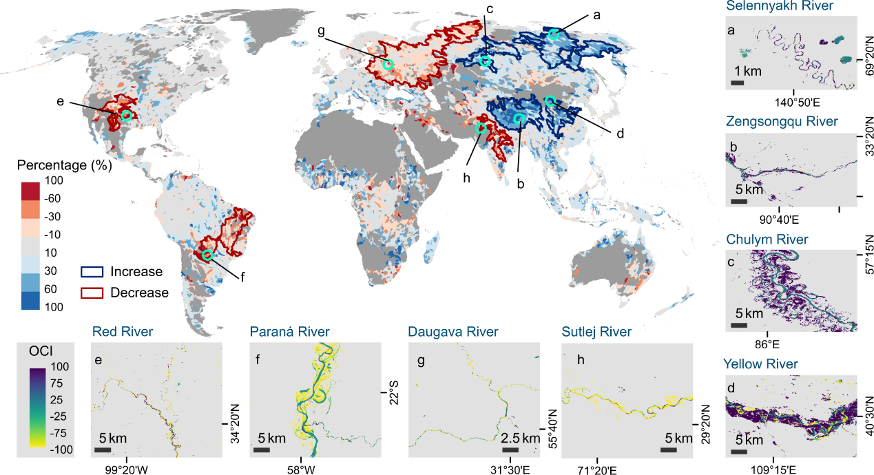 通过使用净增加的相对幅度(增加和减少之间的面积差除以河流总面积)的度量来检索显着的河流变化热点。气候因素和人为因素在这些热点地区的河流流量变化中起着不同的作用。气候变化,特别是降水和蒸散发的变化,在很大程度上决定了区域水平衡和河流流量的变化,气候变暖导致的冰川融化或永久冻土融化加剧也可能促进了这些以永久冻土和/或冰川高覆盖为特征的地区的河流流量上升。人类活动对干旱和半干旱地区狭窄河道的明显影响。