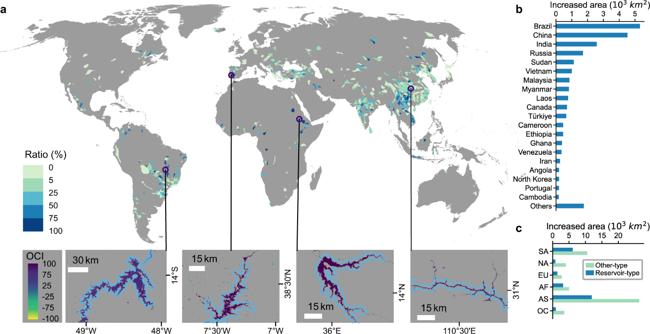 注:a图扩大的水域面积(淹没频率显著增加的地区)与流域河流总面积的比率。下插图(从左到右)是世界上四个典型的巨型水坝,Serra de Mesa大坝(巴西)、Alqueva大坝(葡萄牙)、上Atbara和Setit大坝综合体(苏丹)和三峡大坝(中国)。b各县(区)因新建水坝而扩大的河流总面积统计。c各大陆因筑坝而增加的河流面积与其他类型的扩张(h型)的比较。