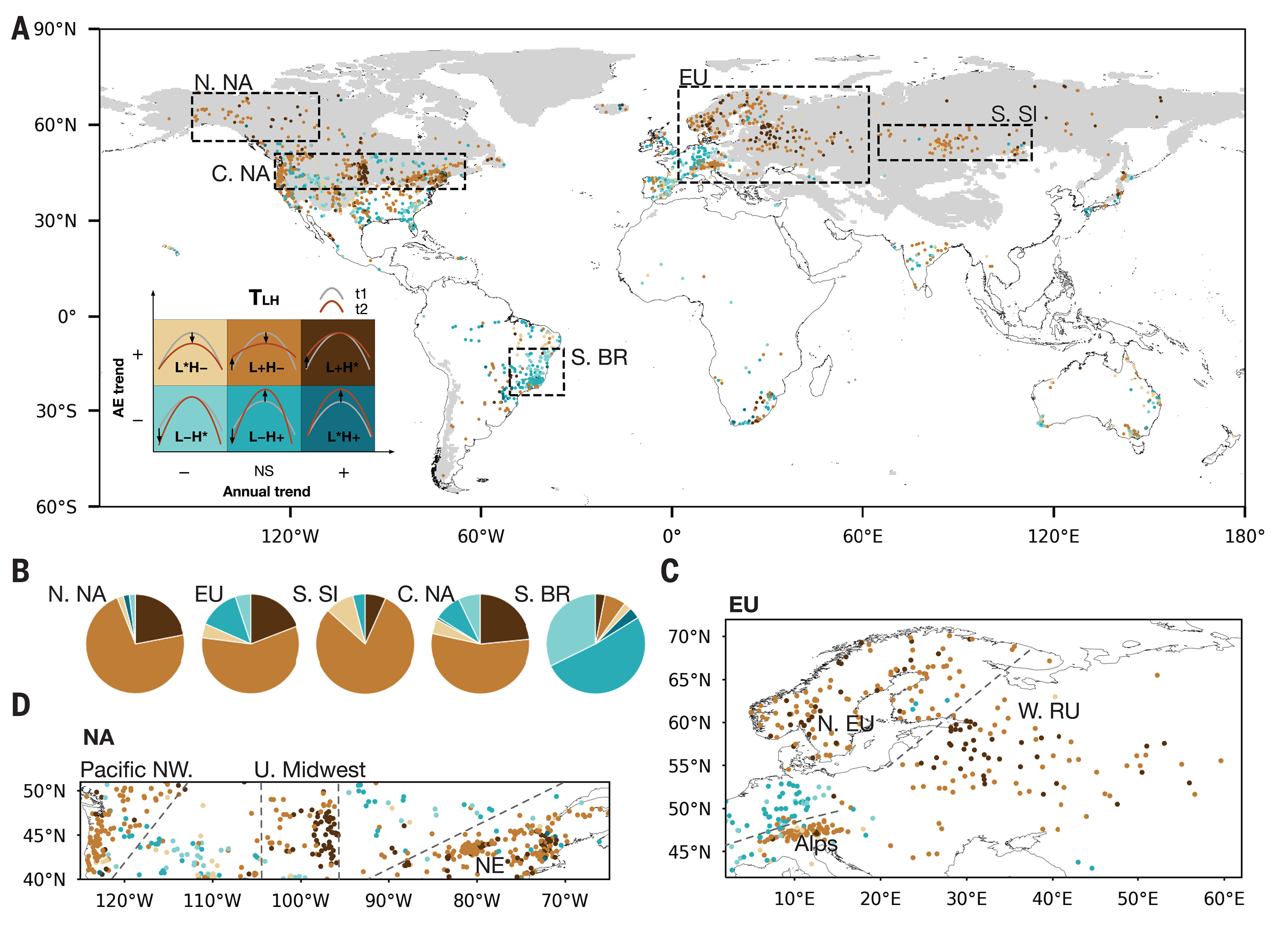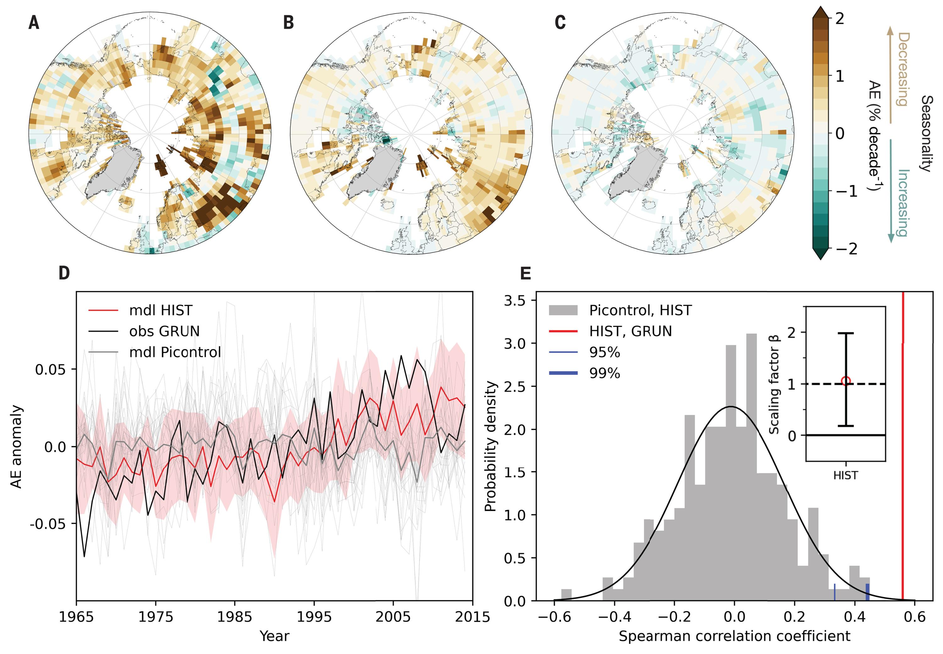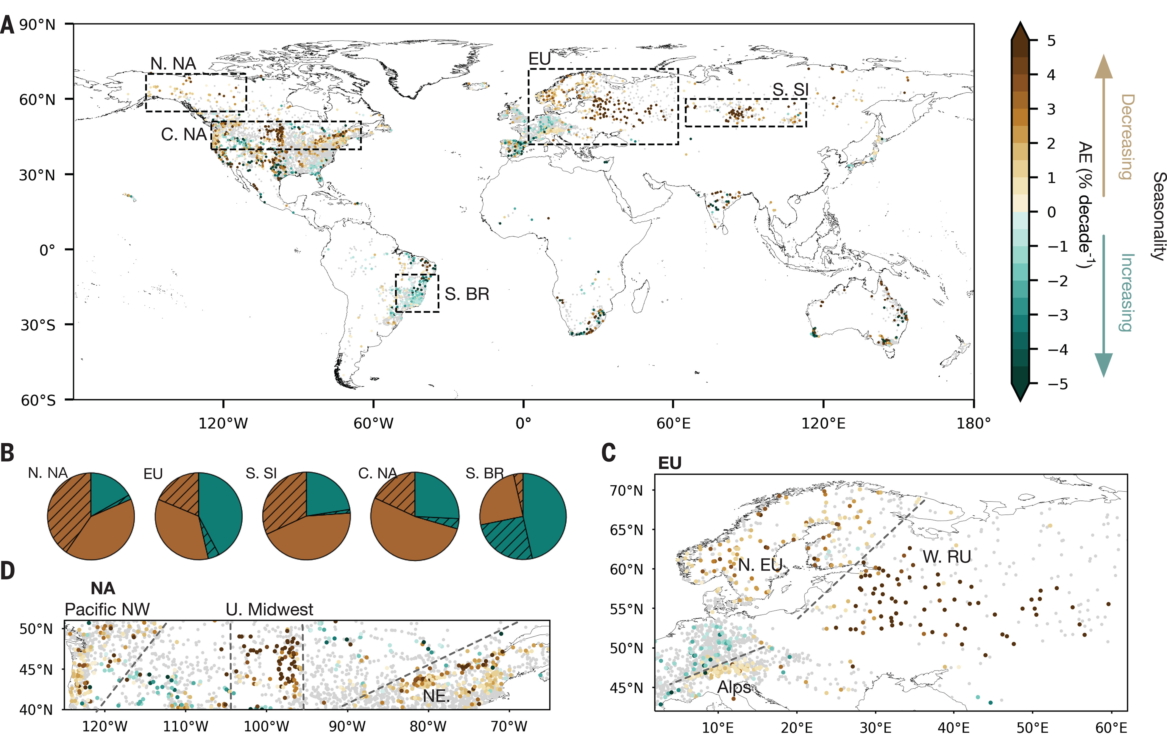 Abstract: Riverine ecosystems have adapted to natural discharge variations across seasons. However, evidence suggesting that climate change has already impacted magnitudes of river flow seasonality is limited to local studies, mainly focusing on changes of mean or extreme flows. This study introduces the use of apportionment entropy as a robust measure to assess flow-volume nonuniformity across seasons, enabling a global analysis. We found that ~21% of long-term river gauging stations exhibit significant alterations in seasonal flow distributions, but two-thirds of these are unrelated to trends in annual mean discharge. By combining a data-driven runoff reconstruction with state-of-the-art hydrological simulations, we identified a discernible weakening of river flow seasonality in northern high latitudes (above 50°N), a phenomenon directly linked to anthropogenic climate forcing.