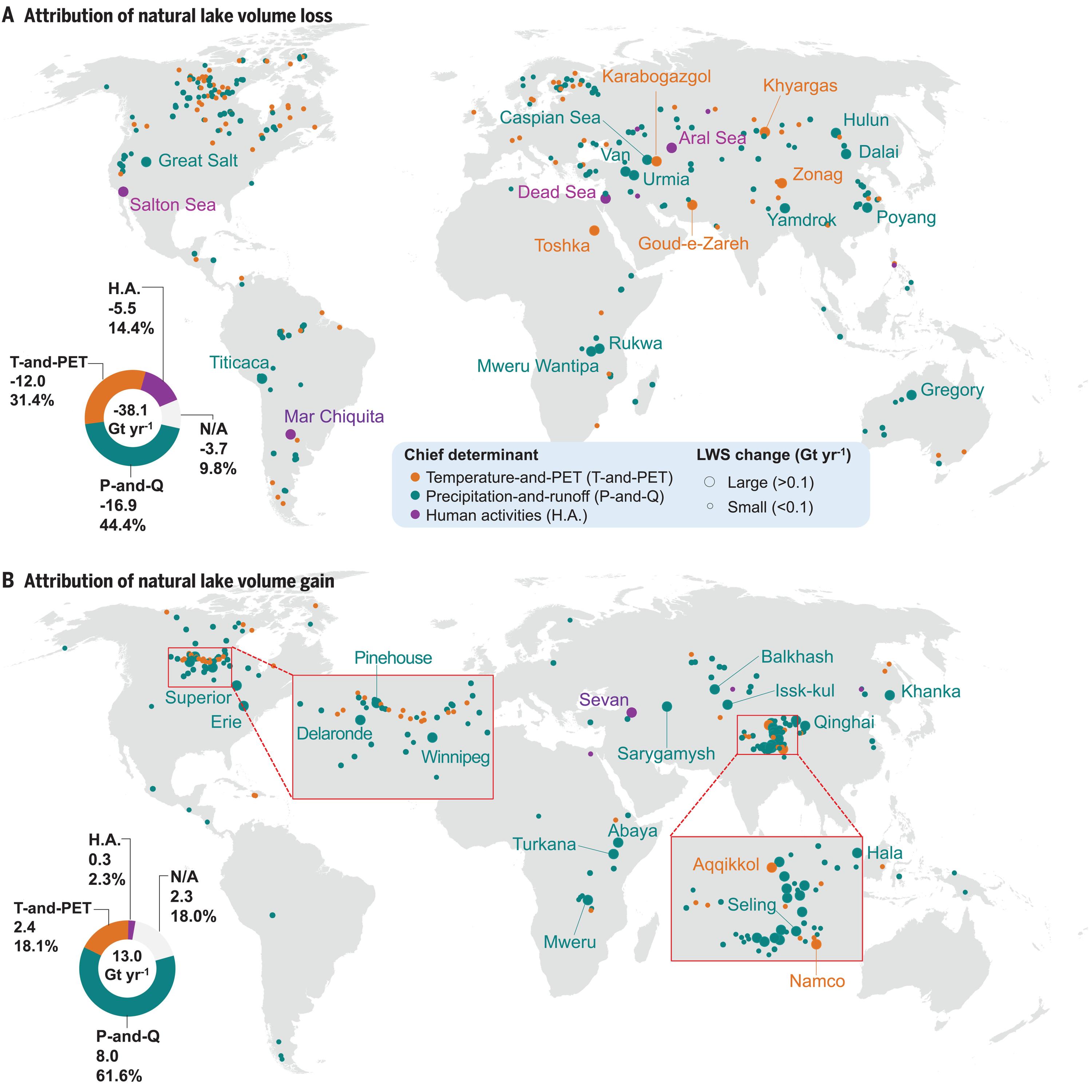 摘要:气候变化和人类活动日益威胁着储存地球表面87%液态淡水的湖泊。然而,全球湖泊体积变化的近期趋势及其驱动因素大多仍未知。在此,我们利用三十年的卫星观测、气候数据和水文模型,对全球1972个最大湖泊进行分析,发现1992至2020年间,这些水体中有53%的湖泊存储量呈统计学意义上的下降。天然湖泊净体积减少很大程度上归因于气候变暖、蒸发需求增加以及人类水资源消耗,而在水库中,沉积作用是存储损失的主要原因。我们估计,全球约有四分之一的人口居住在正在干涸的湖泊流域内,这凸显了将气候变化和沉积作用的影响纳入可持续水资源管理的必要性。