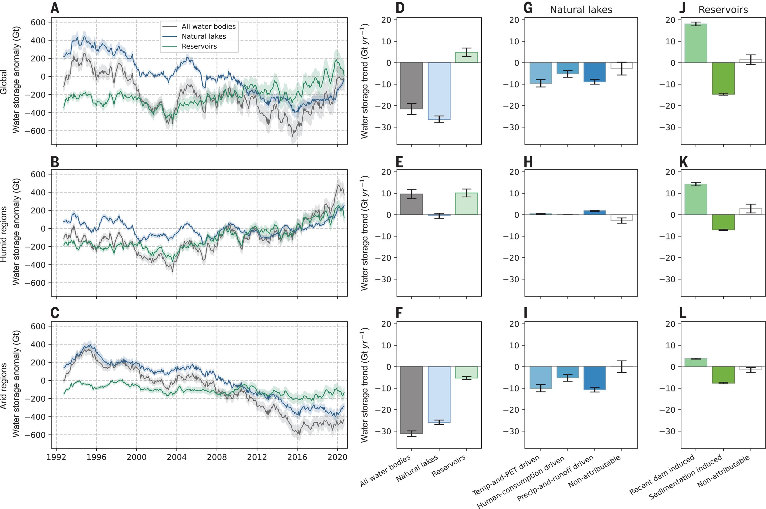 Abstract:Climate change and human activities increasingly threaten lakes that store 87% of Earth’s liquid surface fresh water. Yet, recent trends and drivers of lake volume change remain largely unknown globally. Here, we analyze the 1972 largest global lakes using three decades of satellite observations, climate data, and hydrologic models, finding statistically significant storage declines for 53% of these water bodies over the period 1992–2020. The net volume loss in natural lakes is largely attributable to climate warming, increasing evaporative demand, and human water consumption, whereas sedimentation dominates storage losses in reservoirs. We estimate that roughly one-quarter of the world’s population resides in a basin of a drying lake, underscoring the necessity of incorporating climate change and sedimentation impacts into sustainable water resources management.