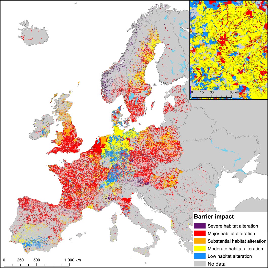 注:研究结果有助于了解在哪些地方建造新建筑可能会造成生境的巨大改变,或者在哪些地方采取恢复措施可能会带来最大的生境增益。每个面板指的是一个单独的屏障类型。根据wRHp值进行分类。紫色是严重生境改变(≤25%),红色是主要生境改变(26-50%),橙色是大量生境改变(51-75%),黄色是中度生境改变(76-90%),蓝色是低度生境改变(>90%)