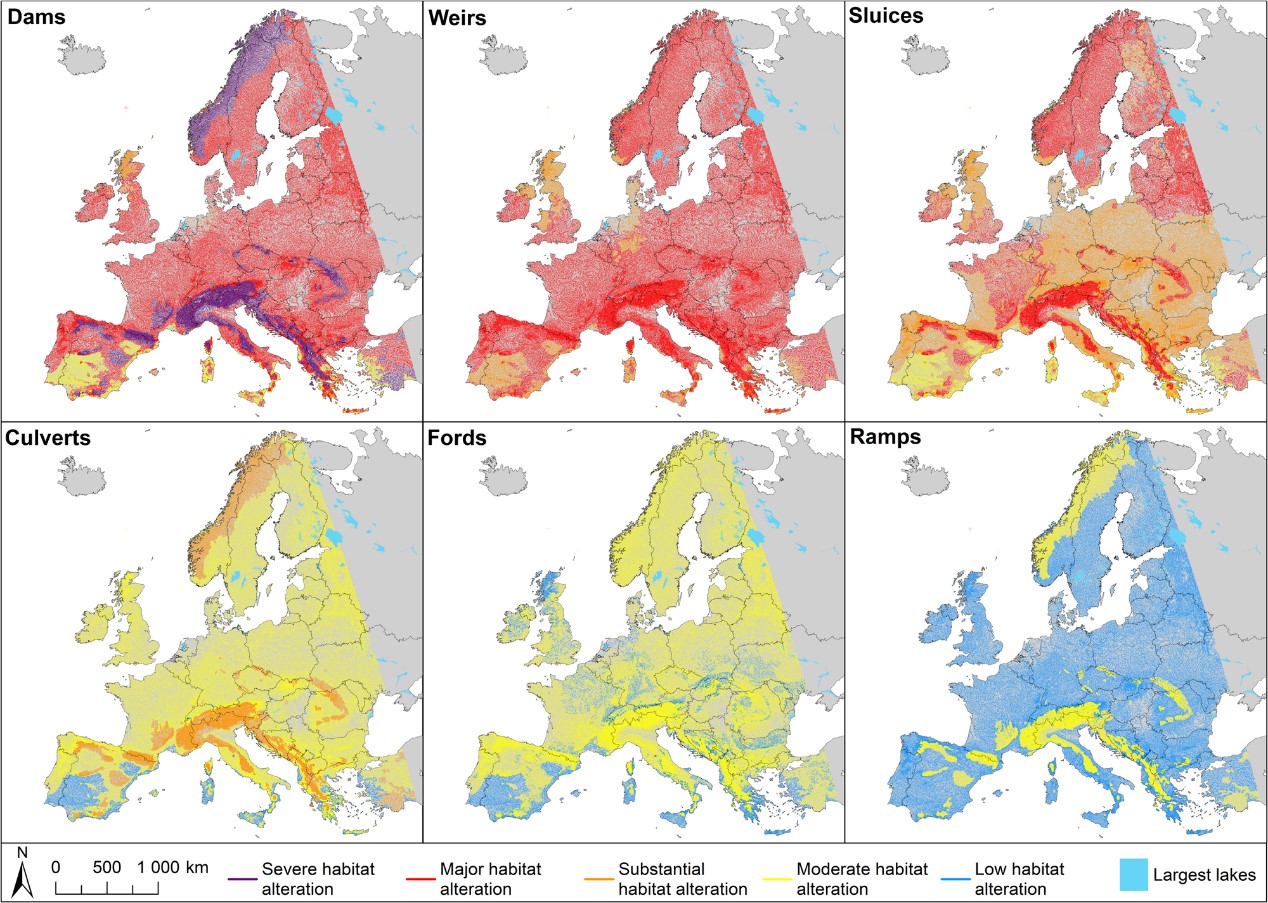 Abstract: European rivers are disconnected by more than one million man-made barriers that physically limit aquatic species migration and contribute to modification of freshwater habitats. Here, a Conceptual Habitat Alteration Model for Ponding is developed to aid in evaluating the effects of impoundments on fish habitats. Fish communities present in rivers with low human impact and their broad environmental settings enable classification of European rivers into 15 macrohabitat types. These classifications, together with the estimated fish sensitivity to alteration of their habitat are used for assessing the impacts of six main barrier types (dams, weirs, sluices, culverts, fords, and ramps). Our results indicate that over 200,000 km or 10% of previously free-flowing river habitat has been altered due to impoundments. Although they appear less frequently, dams, weirs and sluices cause much more habitat alteration than the other types. Their impact is regionally diverse, which is a function of barrier height, type and density, as well as biogeographical location. This work allows us to foresee what potential environmental gain or loss can be expected with planned barrier management actions in rivers, and to prioritize management actions.