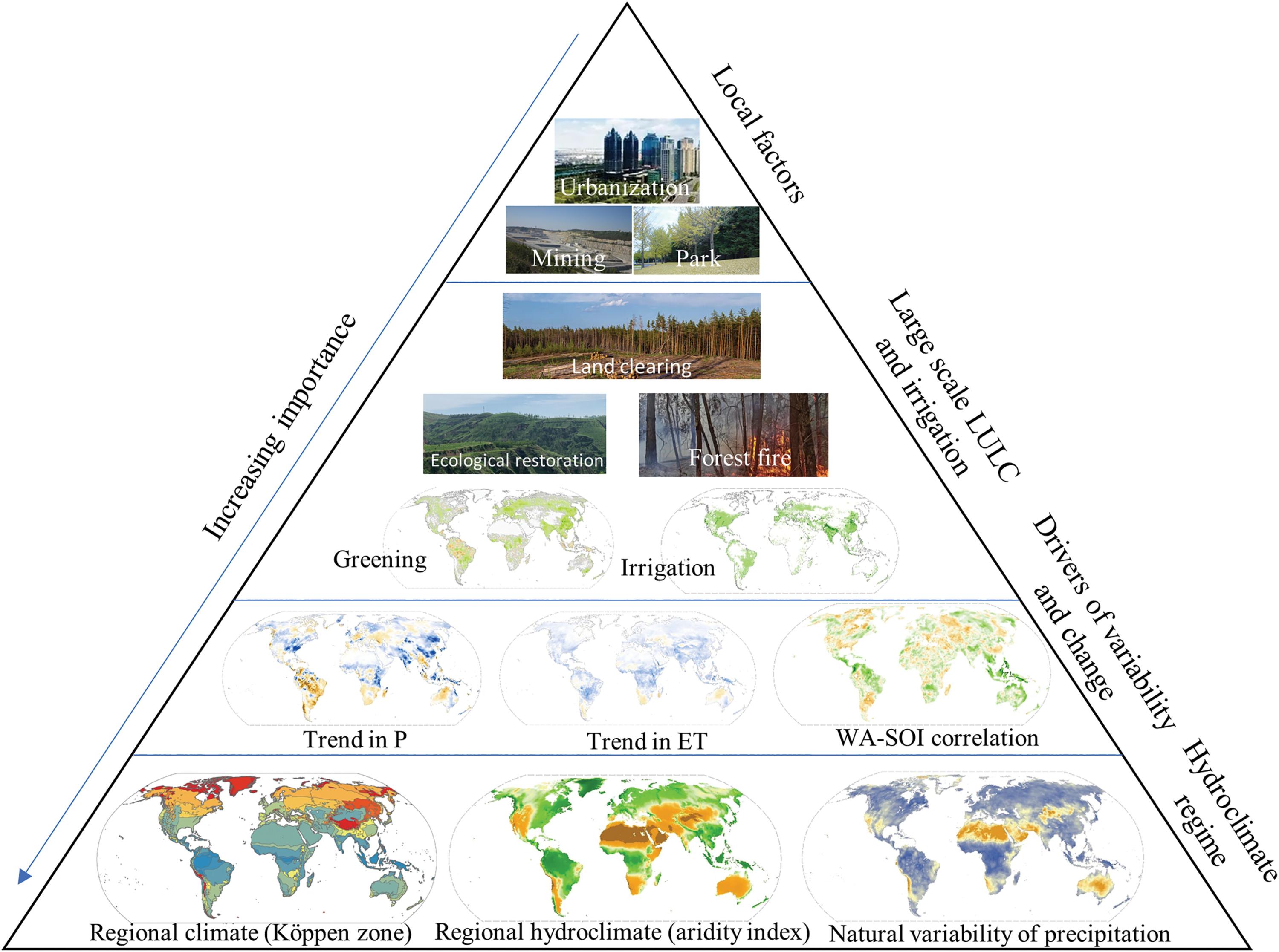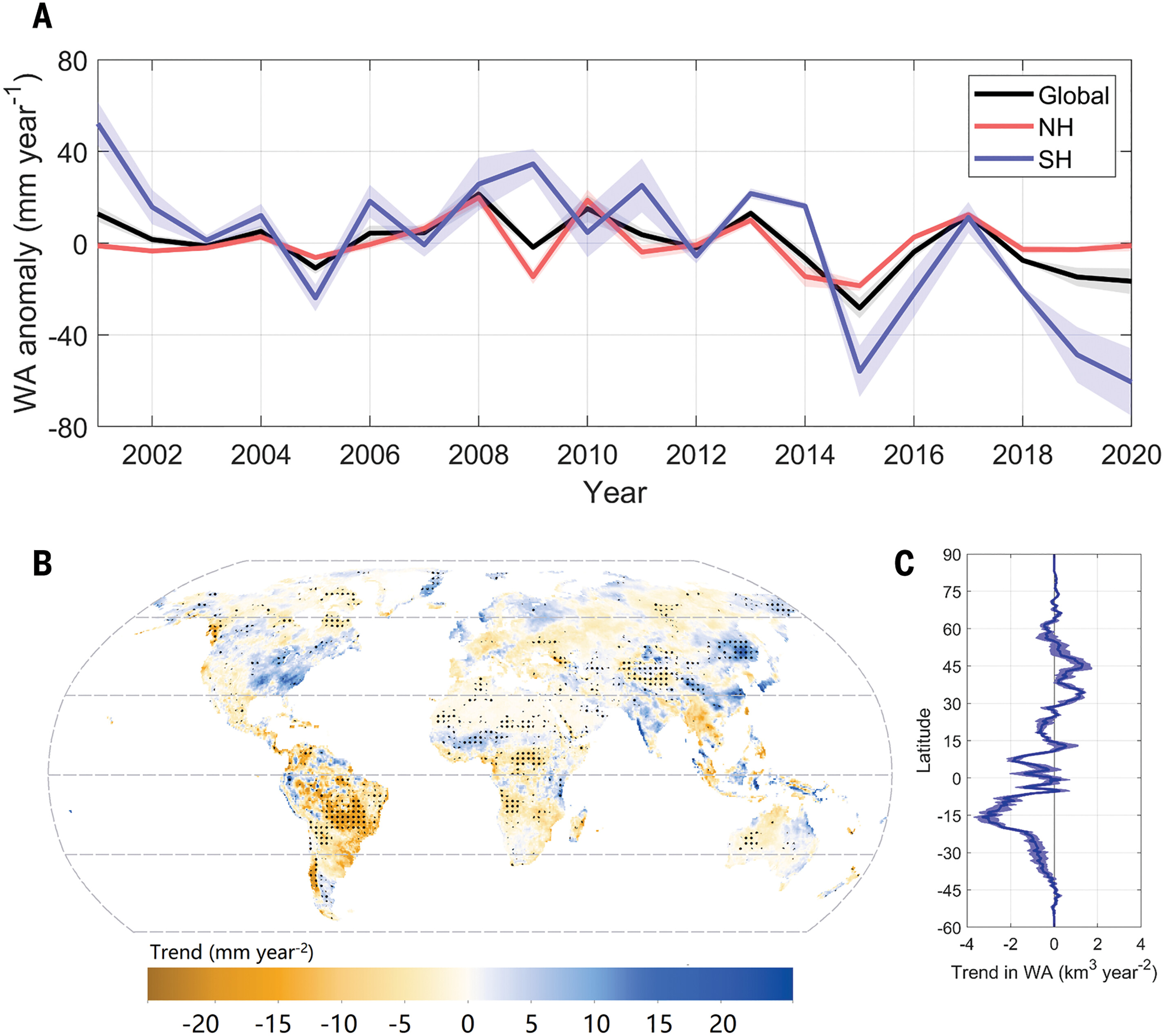 Abstract: Global land water underpins livelihoods, socioeconomic development, and ecosystems. It remains unclear how water availability has changed in recent decades. Using an ensemble of observations, we quantified global land water availability over the past two decades. We show that the Southern Hemisphere has dominated the declining trend in global water availability from 2001 to 2020. The significant decrease occurs mainly in South America, southwestern Africa, and northwestern Australia. In the Northern Hemisphere, the complex regional increasing and decreasing trends cancel each other, resulting in a negligible hemispheric trend. The variability and trend in water availability in the Southern Hemisphere are largely driven by precipitation associated with climate modes, particularly the El Niño-Southern Oscillation. This study highlights their dominant role in controlling global water availability.