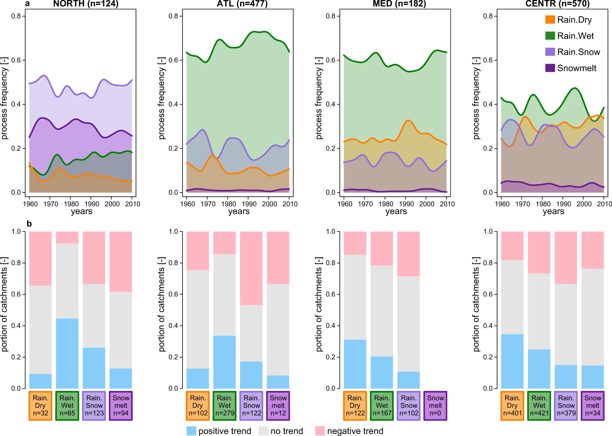 图 欧洲四个地区(北部、大西洋、地中海和中阿尔卑斯)洪水生成过程的变化