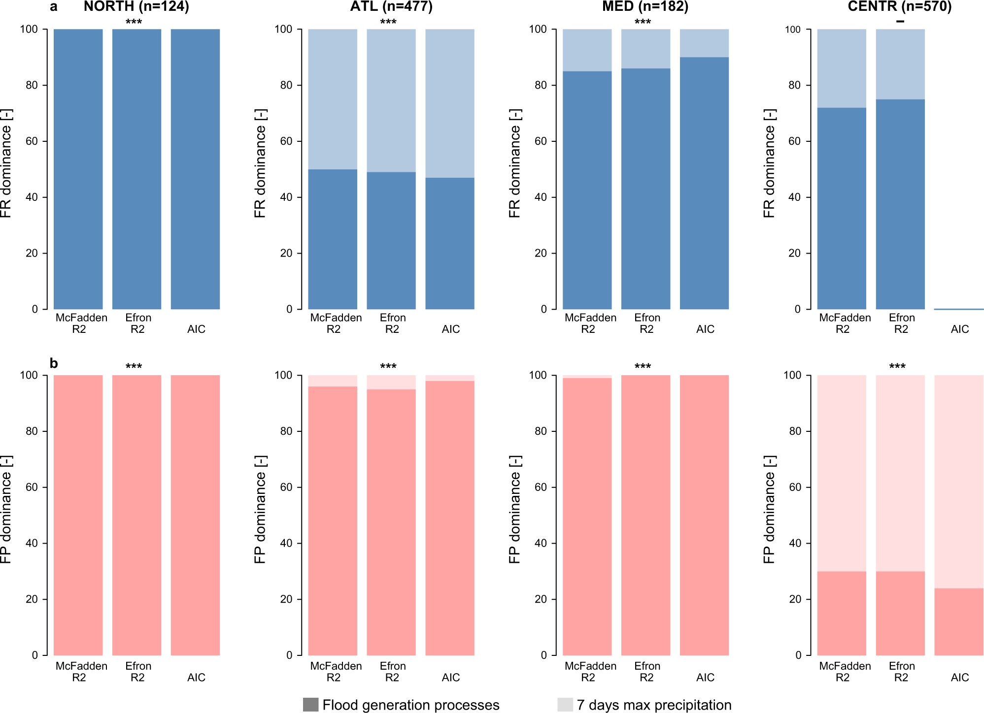 Abstract: Anomalies in the frequency of river floods, i.e., flood-rich or -poor periods, cause biases in flood risk estimates and thus make climate adaptation measures less efficient. While observations have recently confirmed the presence of flood anomalies in Europe, their exact causes are not clear. Here we analyse streamflow and climate observations during 1960-2010 to show that shifts in flood generation processes contribute more to the occurrence of regional flood anomalies than changes in extreme rainfall. A shift from rain on dry soil to rain on wet soil events by 5% increased the frequency of flood-rich periods in the Atlantic region, and an opposite shift in the Mediterranean region increased the frequency of flood-poor periods, but will likely make singular extreme floods occur more often. Flood anomalies driven by changing flood generation processes in Europe may further intensify in a warming climate and should be considered in flood estimation and management.
