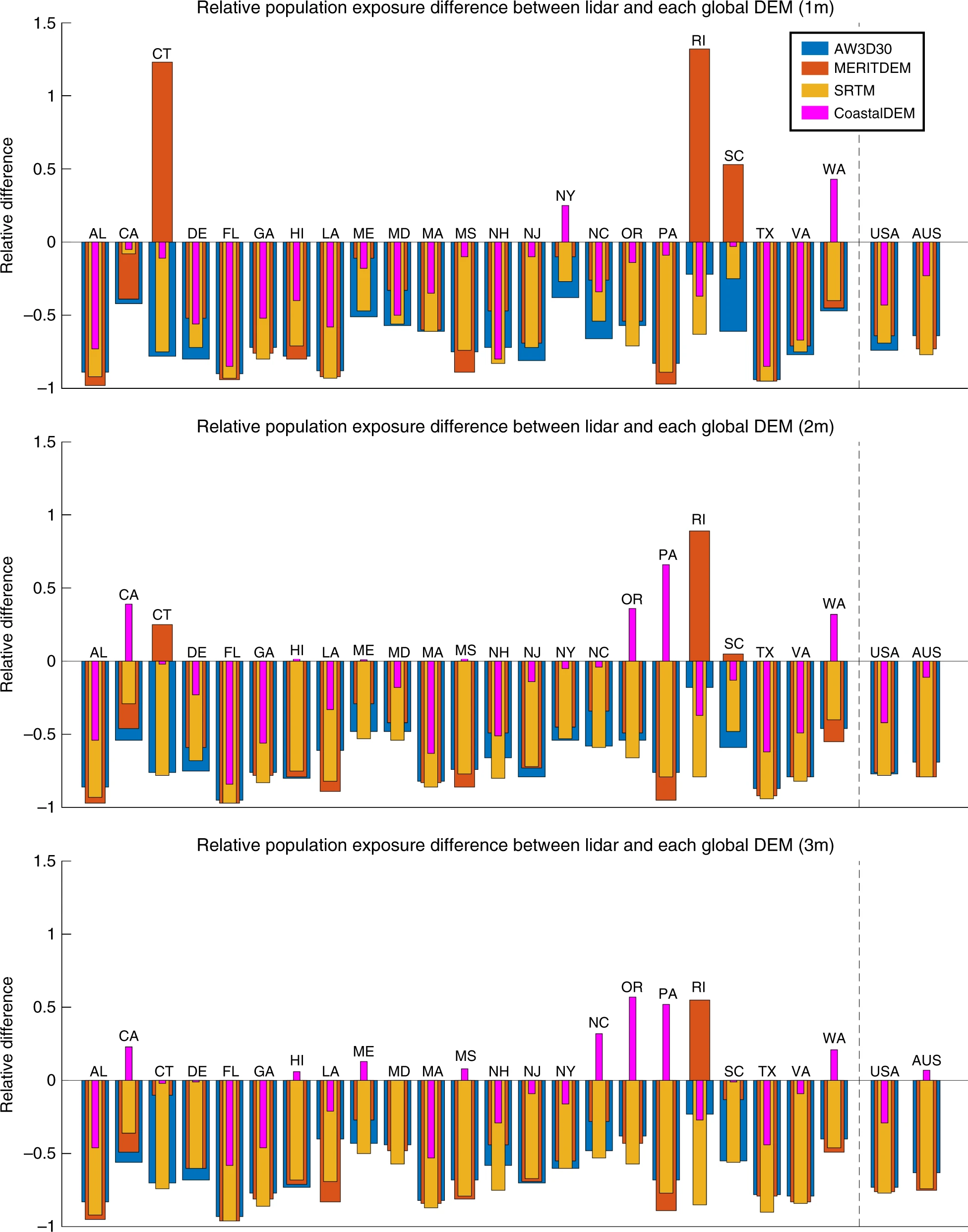 在美国和澳大利亚,生活在1米、2米和3米以下土地上的人口是使用每个DEM计算的。零相对差异表明激光雷达和给定的全球DEM预测的海拔阈值以下的人数相同,而-0.5和0.5则分别表示全球DEM低估或高估了50%。美国各州以及美国和澳大利亚的全国范围内都给出了结果。源数据以源数据文件的形式提供