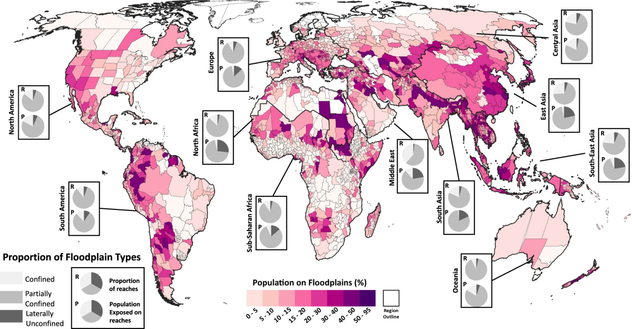 生活在洪泛平原上的每个次国家行政区的人口百分比,洪泛平原被定义为1000年一遇的洪水范围。每个区域的洪泛平原类别中河段的比例由每个框中的顶部饼图显示。在不同类型的洪泛平原上定居的人口比例如每个方框底部的饼图所示。