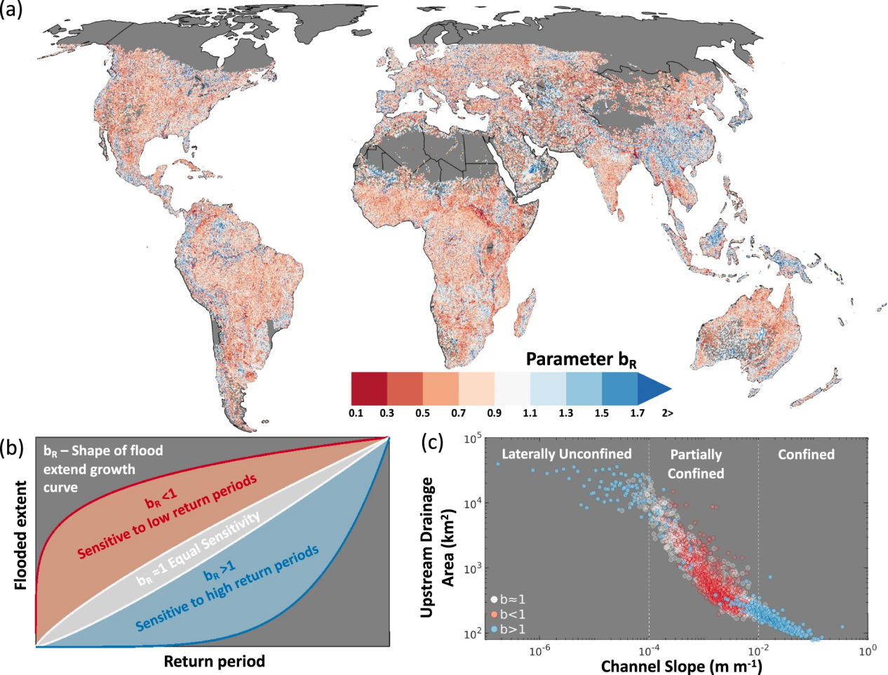 a全球河网(不包括56°N以上的河段)洪水范围对增加超越概率的敏感性。b参数<1表示洪水范围对短重现期(100年及以下洪水事件)的敏感性。b参数>1表示洪水范围对长重现期(100年一遇及以上洪水事件)的敏感性。b一系列b参数的洪水范围增长曲线的形状。c河段b参数、河道坡度与上游流域面积的关系。河段已被放入2000个垃圾箱中(每个垃圾箱约占数据的0.2%)。在河道边坡上设置阈值,以定义三种主要的洪泛区类别:受限、部分受限和侧向非受限。