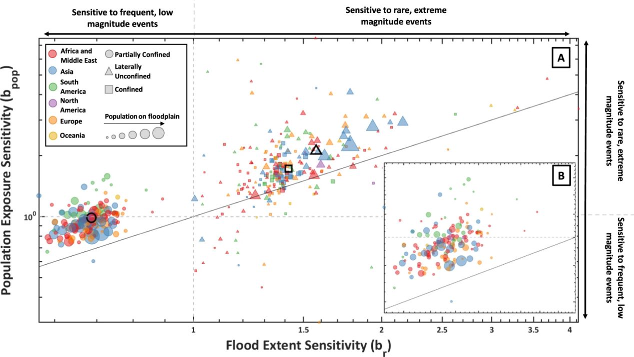 Abstract:Flooding is one of the most common natural hazards, causing disastrous impacts worldwide. Stress-testing the global human-Earth system to understand the sensitivity of floodplains and population exposure to a range of plausible conditions is one strategy to identify where future changes to flooding or exposure might be most critical. This study presents a global analysis of the sensitivity of inundated areas and population exposure to varying flood event magnitudes globally for 1.2 million river reaches. Here we show that topography and drainage areas correlate with flood sensitivities as well as with societal behaviour. We find clear settlement patterns in which floodplains most sensitive to frequent, low magnitude events, reveal evenly distributed exposure across hazard zones, suggesting that people have adapted to this risk. In contrast, floodplains most sensitive to extreme magnitude events have a tendency for populations to be most densely settled in these rarely flooded zones, being in significant danger from potentially increasing hazard magnitudes given climate change.