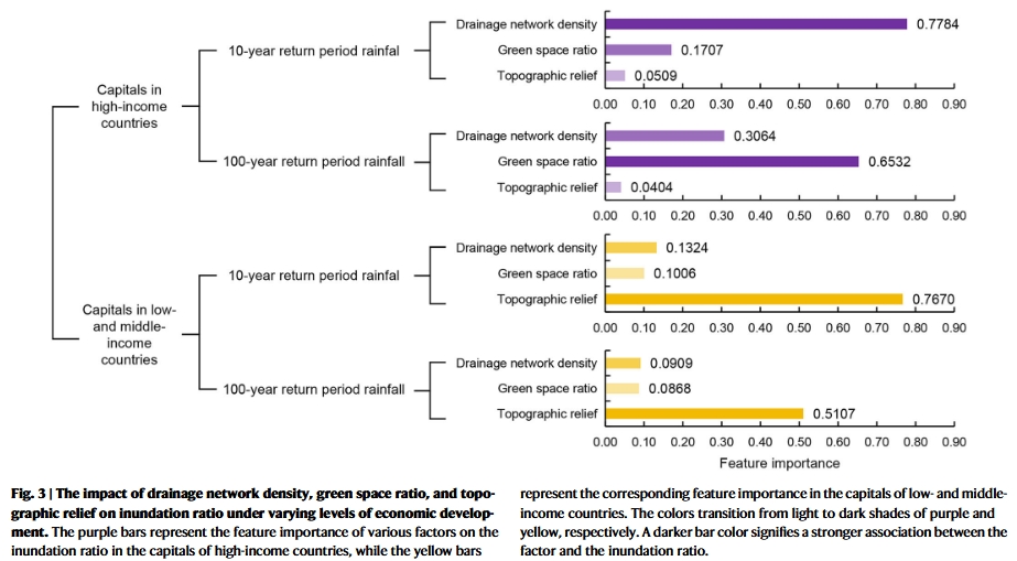 对于中低收入国家,应重视基于自然的解决方案,如合理利用地形和增加绿地面积,以增强城市抵御内涝的能力。此外,对于小城镇和社区,绿色基础设施的应用可能是提高其排水效率和韧性的有效途径,值得进一步研究和推广。