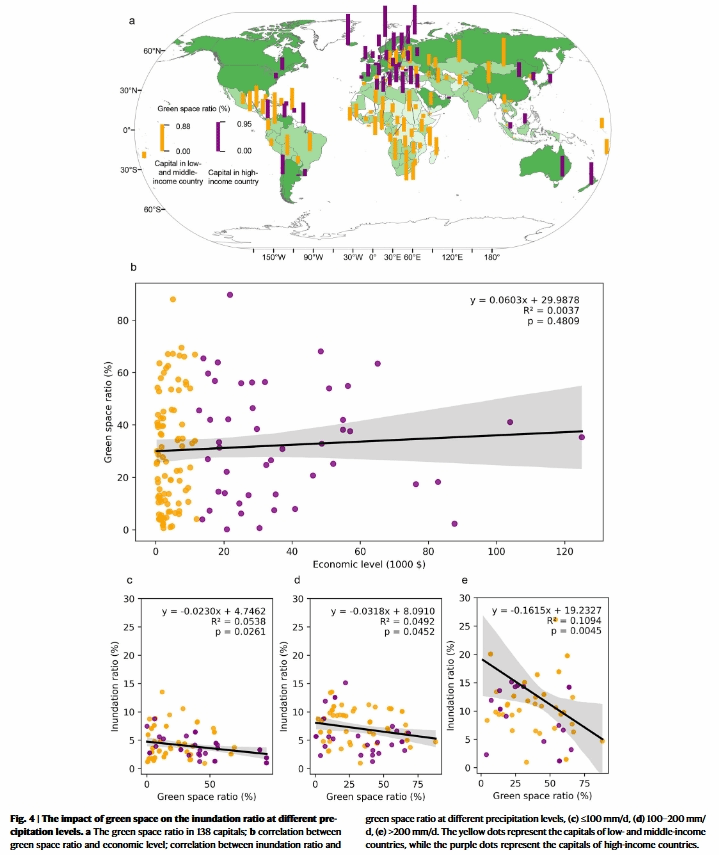 Abstract: In recent years, measures proposed to address urban flooding caused by extreme rainfall often demand substantial investment, restricting their broad implementation. This study quantitatively assessed the inundation situations of 138 capital cities under both normal and extreme rainfall conditions. Using machine learning techniques, we found that grey infrastructure—closely commensurate with a city’s economic development—dominates flood reduction during normal rainfall events. However, during extreme precipitation, as rainfall intensity rises, the marginal effectiveness of grey infrastructure declines markedly. In contrast, green infrastructure and topography—less commensurate with economic development—play increasingly critical roles in mitigating urban flooding. These findings suggest that economic development has a limited impact on urban flooding during extreme rainfall events. Rationally utilizing topography and enhancing green spaces provides a costeffective nature-based solution, which is particularly important for urban planning in low- and middle-income countries undergoing rapid urbanization.