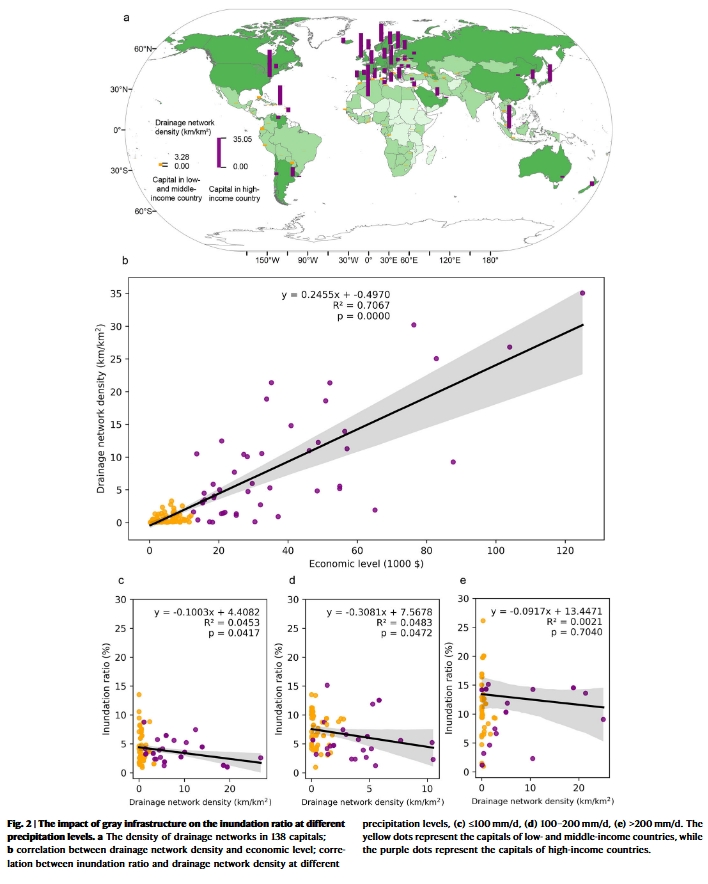 目前,应对极端降雨引发的城市内涝的措施往往需要大量投资,限制了其广泛实施。研究表明,灰色基础设施(如城市雨水管网、排水泵站等)、绿色基础设施(如绿地、湿地等)和地形是影响城市应对内涝能力的主要因素。然而,以往研究在提出城市内涝解决方案时,往往忽视了城市经济能力和发展水平的差异,导致这些方案在全球范围内的推广面临挑战。
