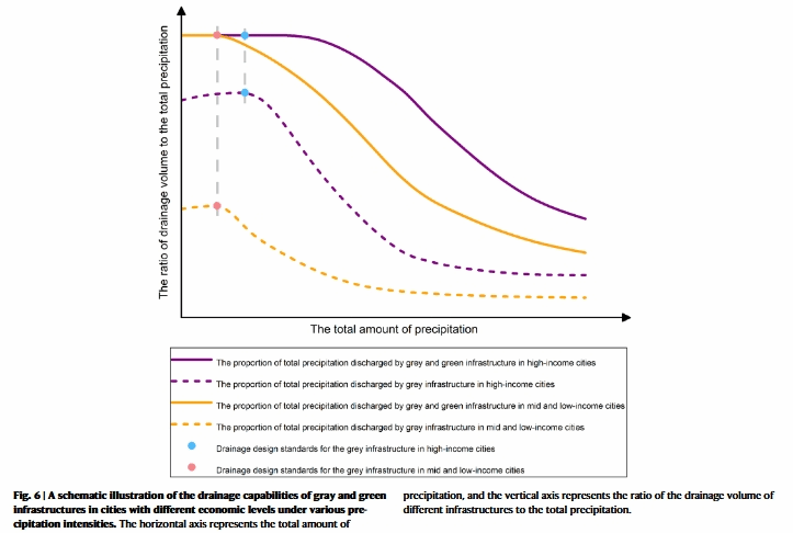 06 不同降水强度下不同经济水平城市灰色和绿色基础设施的排水能力示意图