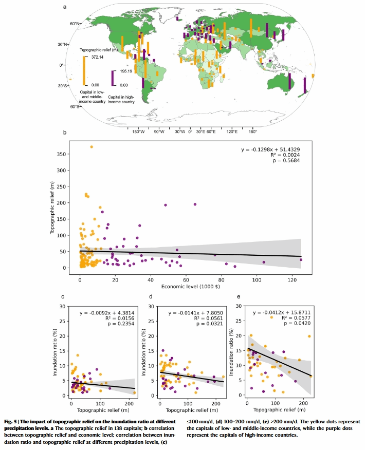 数据收集与处理:研究选取了138个首都城市,收集了降水数据(来自Multi-Source Weighted-Ensemble Precipitation, MSWEP)、排水管网数据(基于GRIP4 Global Road Data并根据城市经济水平调整)、绿地分布数据(来自ESA CCI Land Cover土地利用数据)和地形起伏数据(来自Global Multi-resolution Terrain Elevation Data 2010)。