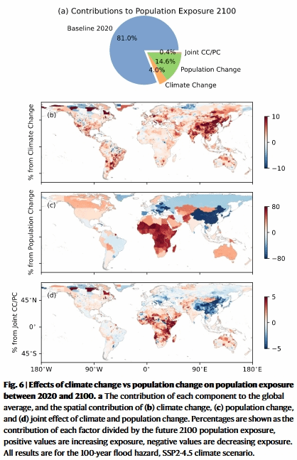 人口暴露增加:预计从2020年到2100年,面临100年一遇洪水风险的人口将从16亿增加到19亿。其中,气候变化导致的暴露增加占21.1%,人口变化导致的暴露增加占76.8%,两者共同作用导致的暴露增加占2.1%。