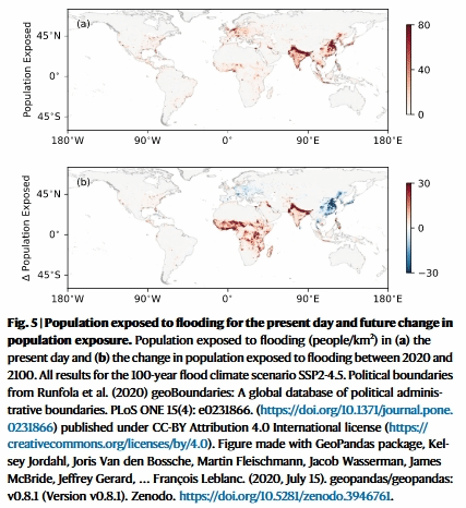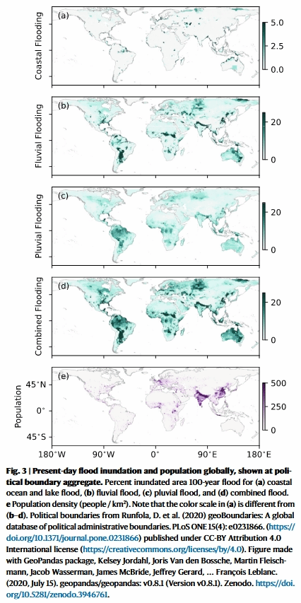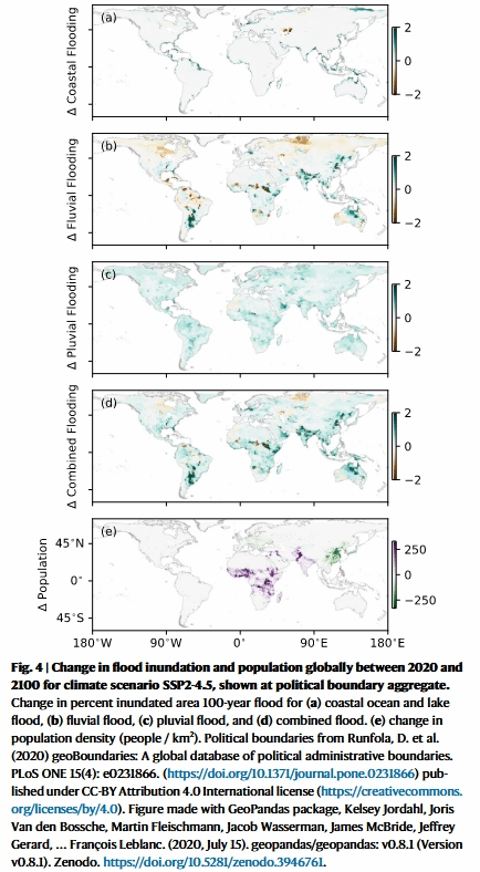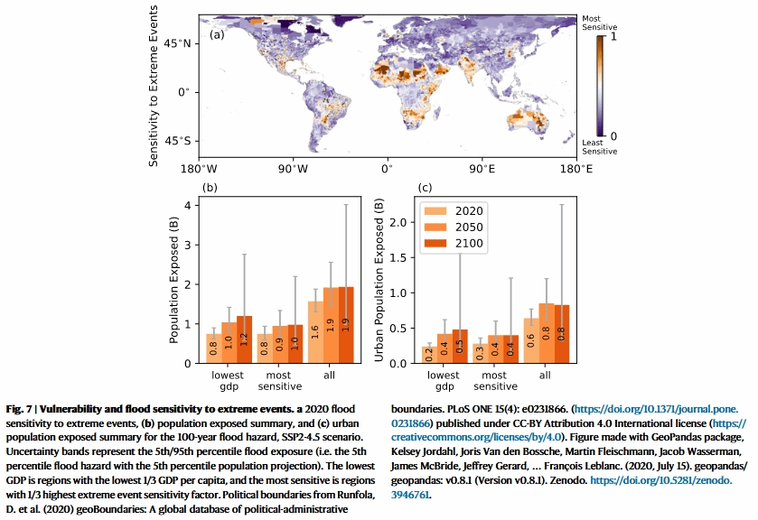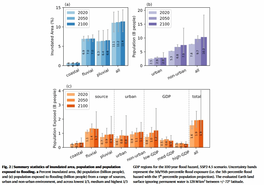 Abstract: Flooding is a pervasive natural hazard with wide-ranging impacts on society. Using a high-resolution global flood model considering coastal, fluvial, and pluvial hazards, we clarify the role of climate effects versus population growth effects in changing flood exposure. Between 2020 and 2100, the population likely exposed to 1% annual risk (100-year) flood hazard will increase from 1.6 to 1.9 billion people. Of this change from the 2020 exposure, we attribute 21.1% to climate change, 76.8% to population change, and 2.1% to both climate and population change. The largest driver of uncertainty in exposure is population change, while climate change remains a smaller but still important driver. The global increase in exposure between 2020 and 2100 is primarily driven by lowGDP regions, and by 2100 the lowest GDP areas will make up 63% of the exposure both overall and in urban areas. Urban areas are especially vulnerable in nearly all global regions, and urban areas sensitive to extreme events are expected to see a 33% increase in population exposure. This study highlights the vast inequities in flood exposure, and future work should direct resources and strategies toward sustainable risk mitigation in these areas.