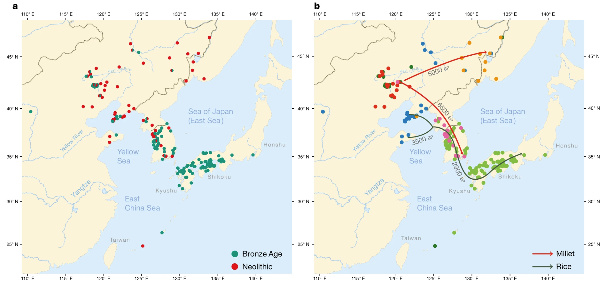 a、 255处新石器时代(红色)和青铜时代(绿色)遗址的地理分布。b、 根据补充数据25中的贝叶斯分析,彩色点根据文化相似性对调查地点进行聚类,表明小米和大米在时间和空间上的传播。图2中考古遗址的分布图2小于图中当代语言的分布图1,因为我们关注的是新石器时代和青铜时代语言亚群的早期传播,以及农业向东传播和语言传播之间的联系。