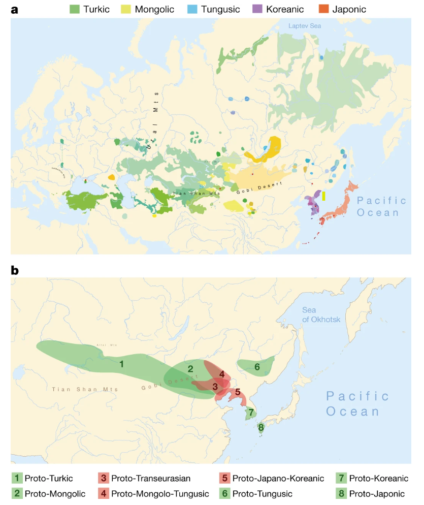 使用泛欧亚语系(即日语、韩语、通古斯语、蒙古语和突厥语)的人的起源和早期传播是欧亚人口历史中最具争议的问题之一。一个关键问题是语言传播、农业扩张和人口流动之间的关系。
