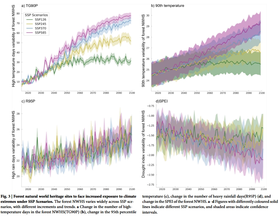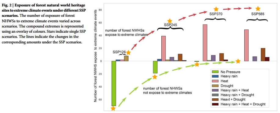 Abstract: Natural world heritage sites face increasing risk under rapid climate change, especially considering the impacts of climate extremes. However, there is not yet enough understanding of the future extreme climate challenges at global natural world heritage sites. Here we identify the exposure of 250 natural heritage sites to extreme climate events under 4 different future scenarios. We found that by 2100 under the highest emission scenario, 248 out of 250 sites were exposed to extreme climate events. Forest natural world heritage sites may face increasing pressure to complex extreme phenomena under emission rise. In tropical regions, where high temperatures may magnify the vulnerability of biodiversity, we identify 14 natural world heritage sites to be prioritised that are poor in biodiversity and expected to face high temperatures. Hence, there is an urgent need for enhanced climate change adaptation at heritage sites to minimise loss of irreplaceable values.