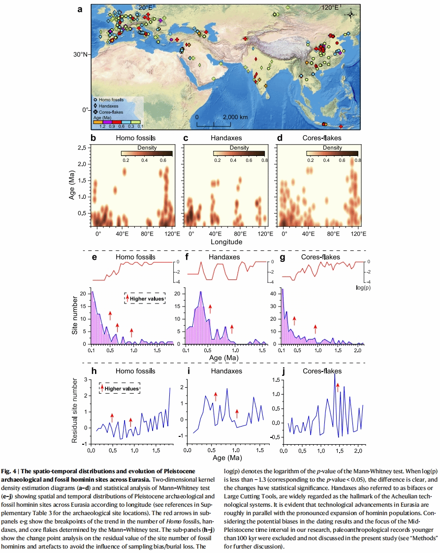 古生物和考古记录整合:结合了欧亚大陆的古生物记录和考古记录,分析了人类祖先遗址的时空分布,以及这些遗址与古气候和古生态变化的关系。