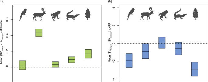 物种脆弱性热点和冷点之间的气候变化差异,以及物种脆弱性热点和冷点之间人类足迹的变化差异。中央实线表示随机热点点和随机冷点点之间的平均差异,上限和下限代表用1000个引导复制计算的90%的置信区间。