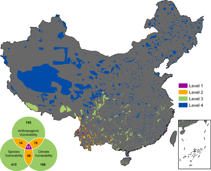 因此,通过制定包含物种脆弱性、气候脆弱性和人为脆弱性三个维度的框架来量化中国2500多个保护区的威胁水平,并根据保护区的脆弱性分数将其分类为不同的威胁类别,并确定需要高度保护关注的区域。
